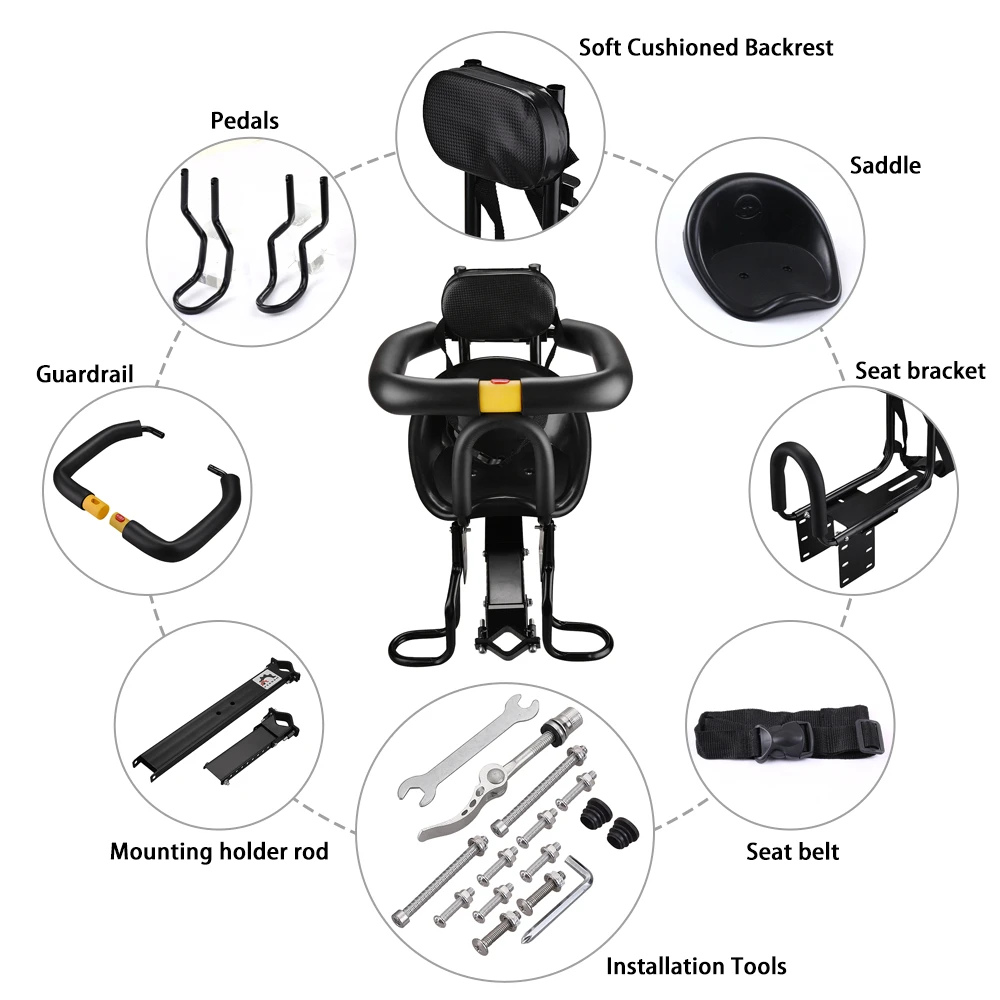 Safety Child Bicycle Seat Bike Front Baby Seat Kids Saddle with Foot Pedals Support Back Rest for MTB Road Bike