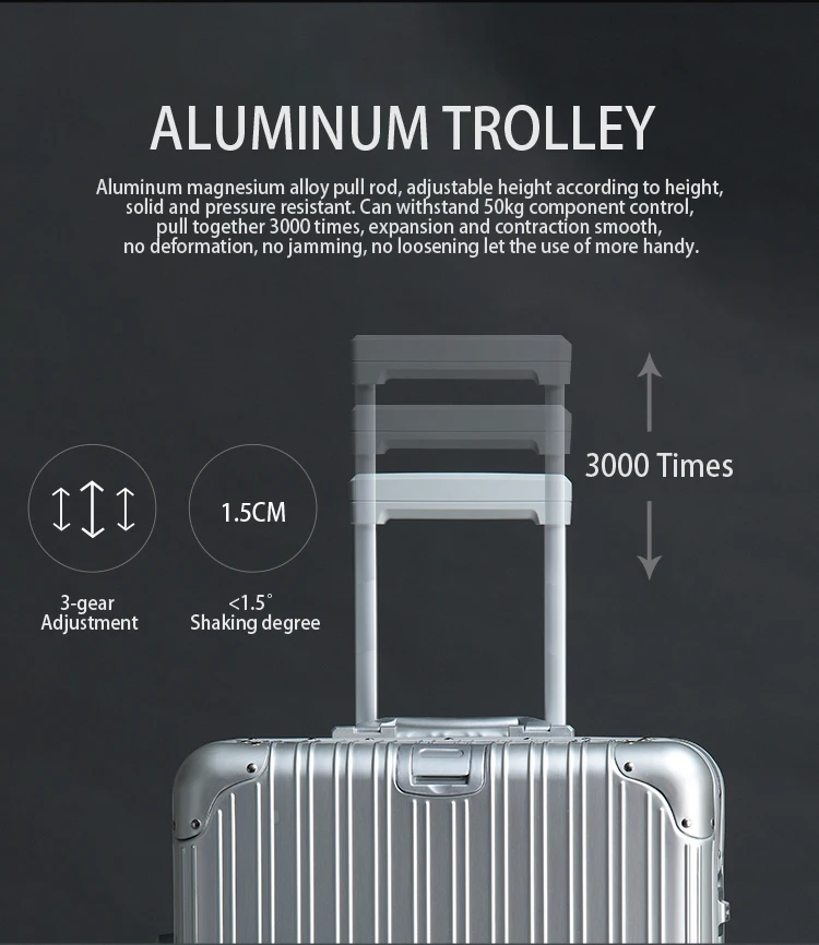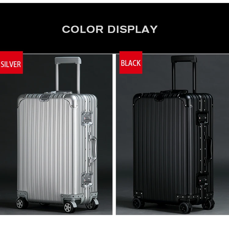 Introducing the pinnacle of travel sophistication: our 100% Aluminum-Magnesium Alloy Travel Suitcase. Engineered for the discerning traveler, this premium rolling luggage seamlessly blends robust construction with elegant design, ensuring your belongings are protected in unparalleled style. Whether embarking on a weekend getaway or a globe-trotting adventure, this trolley suitcase is your ultimate travel companion, offering exceptional quality and timeless appeal.