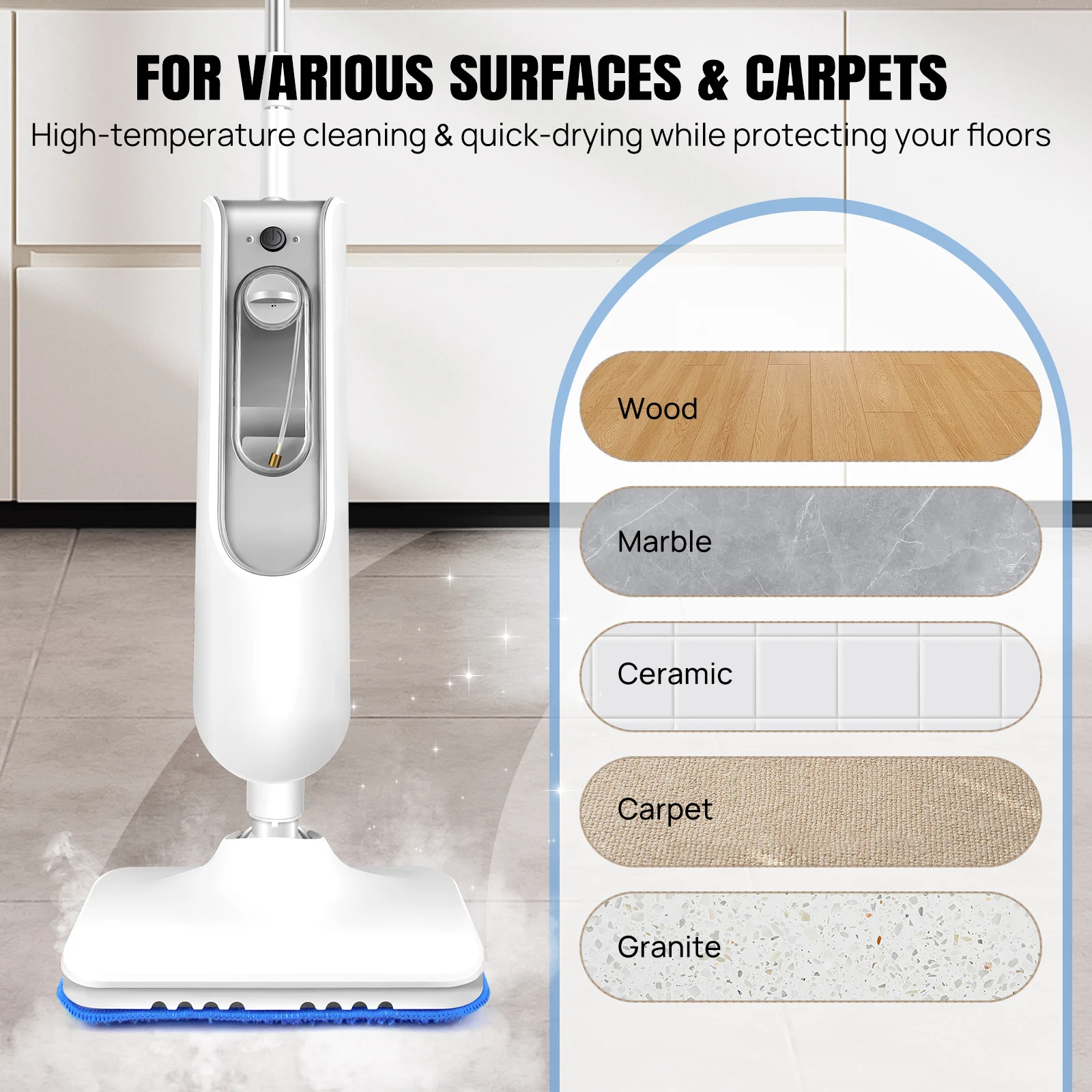 – Powerful 5000W Steam Output: Generates high-temperature steam rapidly to break down stubborn dirt and sanitize surfaces.