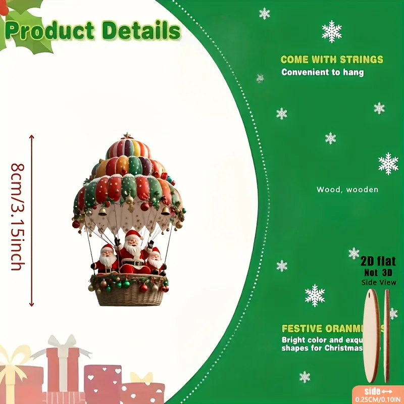 Transform your home into a winter wonderland this holiday season with our exquisite 12-piece 2D Wooden Hanging Decoration Set. Designed to bring joy and a touch of rustic charm to your Christmas tree and beyond, this collection features delightful mobile Santa Claus and whimsical hot air balloon designs. Each piece is crafted with meticulous attention to detail, promising to add a unique and memorable flair to your festive decor.