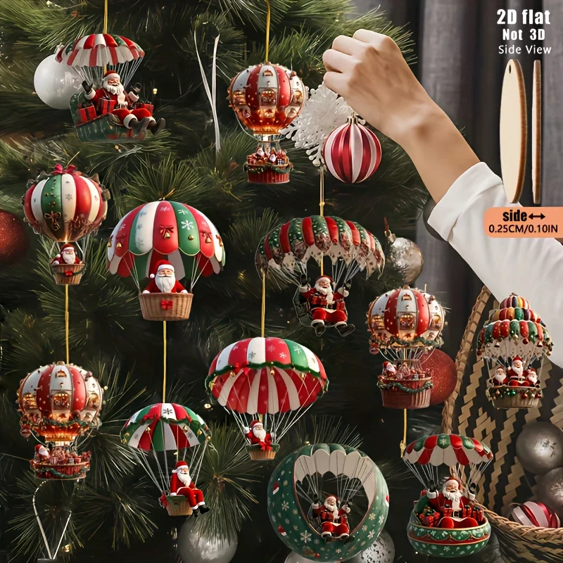 12 pcs Christmas Tree 2D Wooden Hanging Decoration Set with Mobile Santa Claus and Hot Air Balloon – The Perfect Holiday Gift Deco