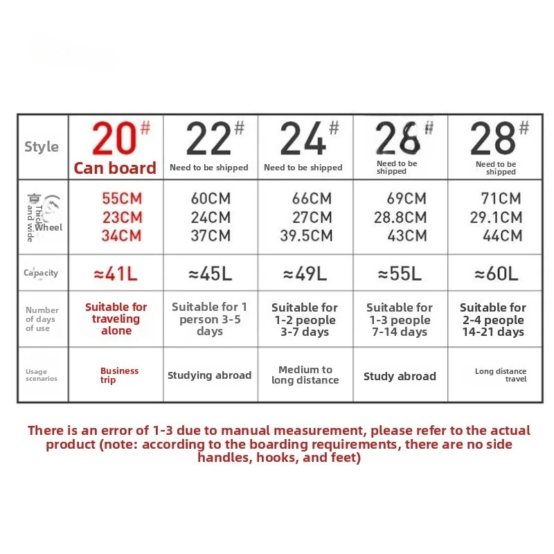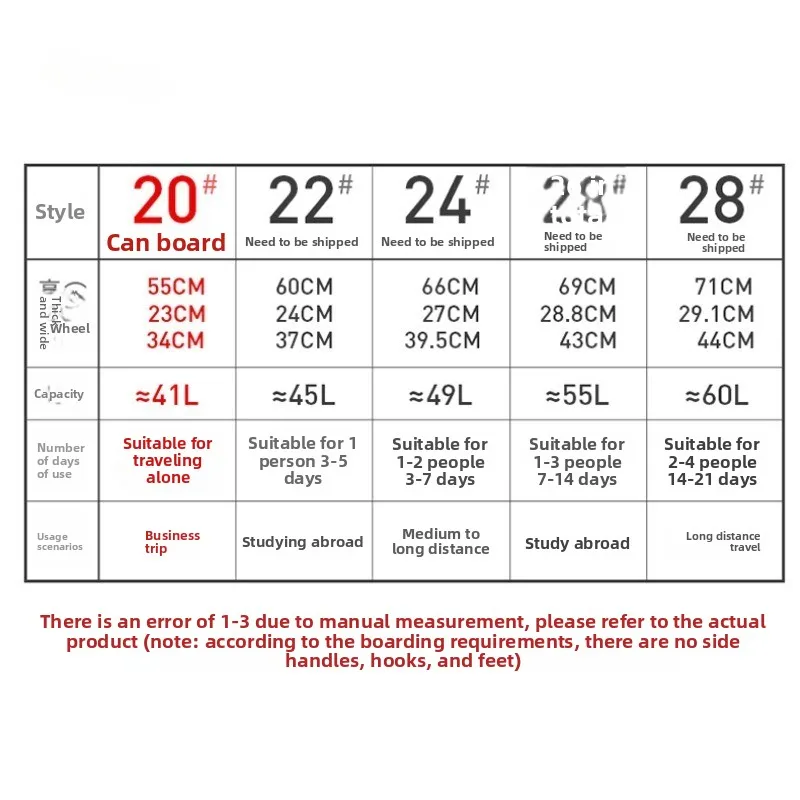 - Multiple luggage sizes available to suit all travel needs: 20 Inches (500 mm), 22 Inches (550 mm), 24 Inches (600 mm), 26 Inches (650 mm), 28 Inches (700 mm).