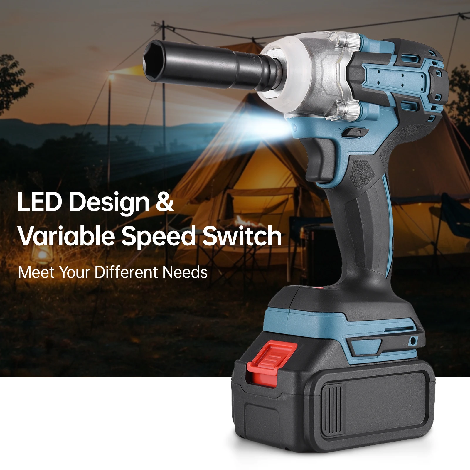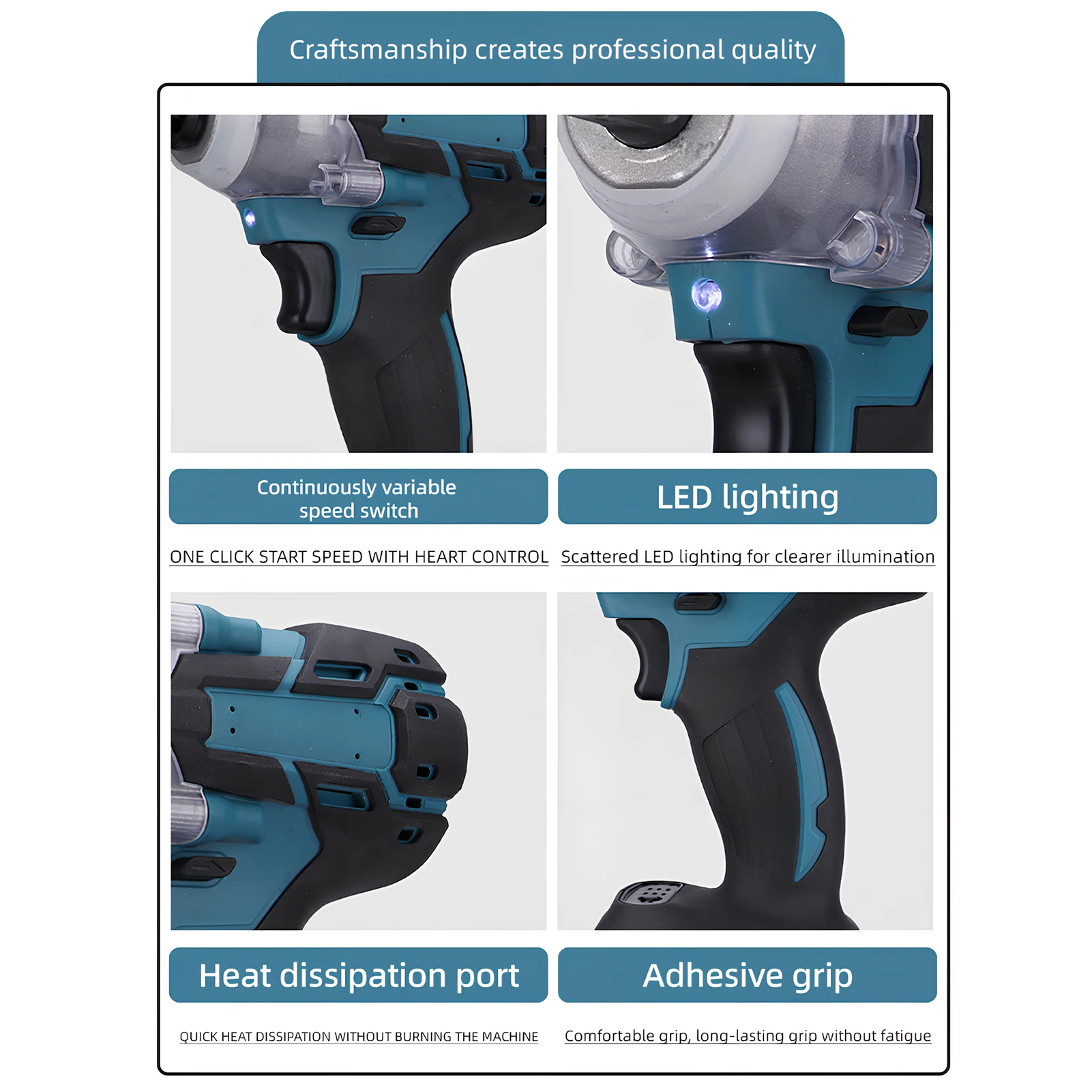 This impact wrench is ideal for automotive repairs, bike maintenance, and various sports and recreation applications. Its brushless motor ensures longer motor life and reduced maintenance, while the stepless speed control allows you to adjust power output according to the task. The robust torque capacity makes it perfect for removing stubborn bolts and nuts, saving time and effort. Dual batteries guarantee uninterrupted work sessions, making it suitable for both professional workshops and home garages.