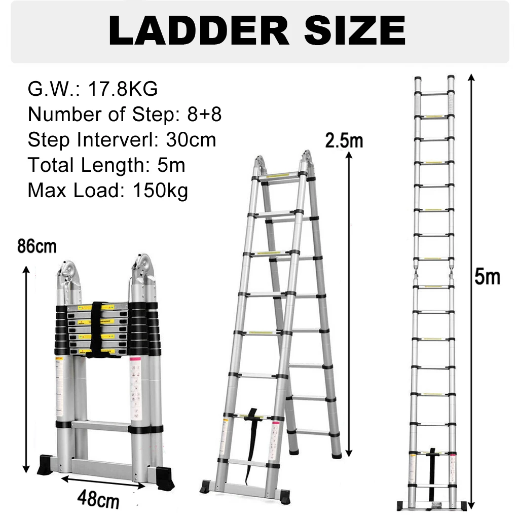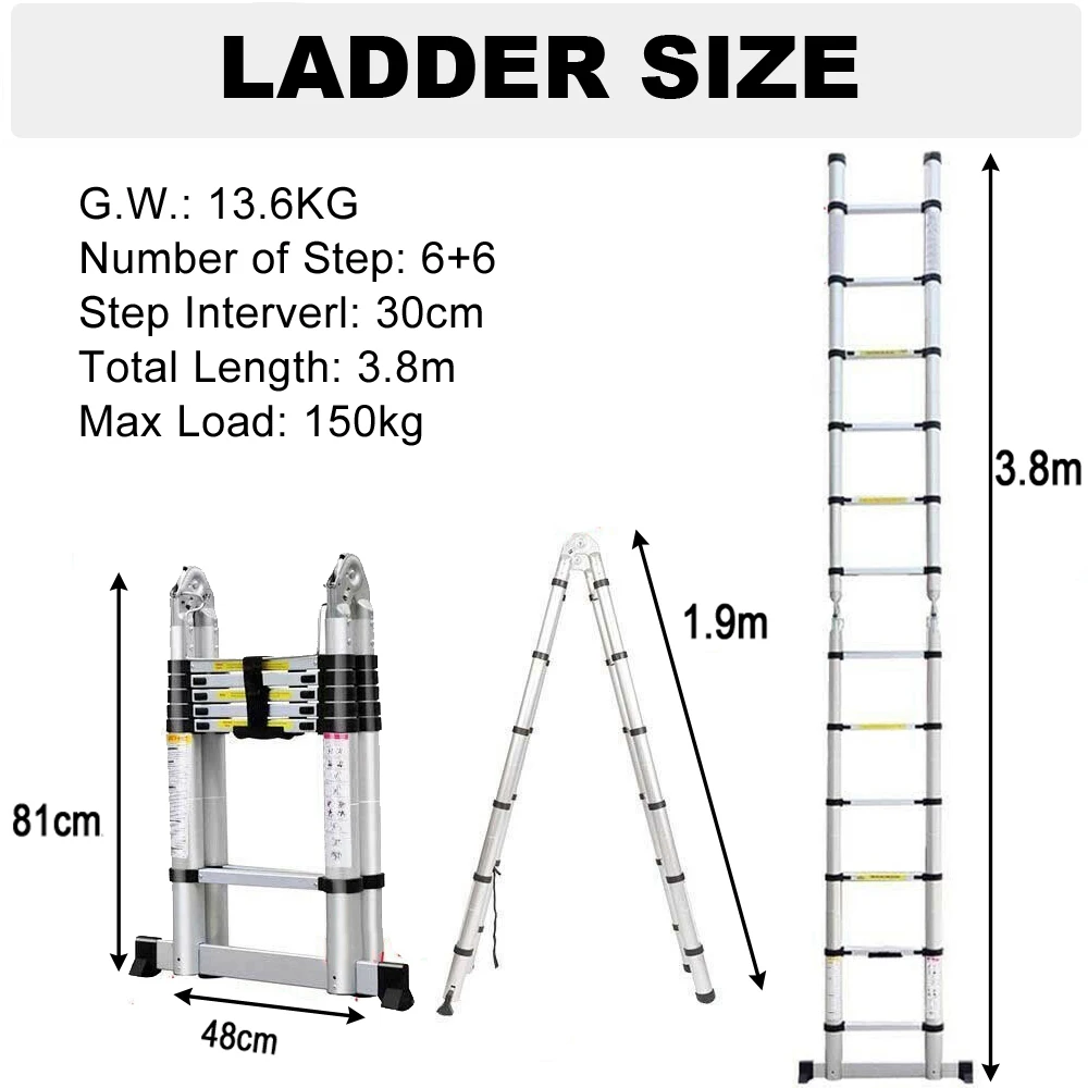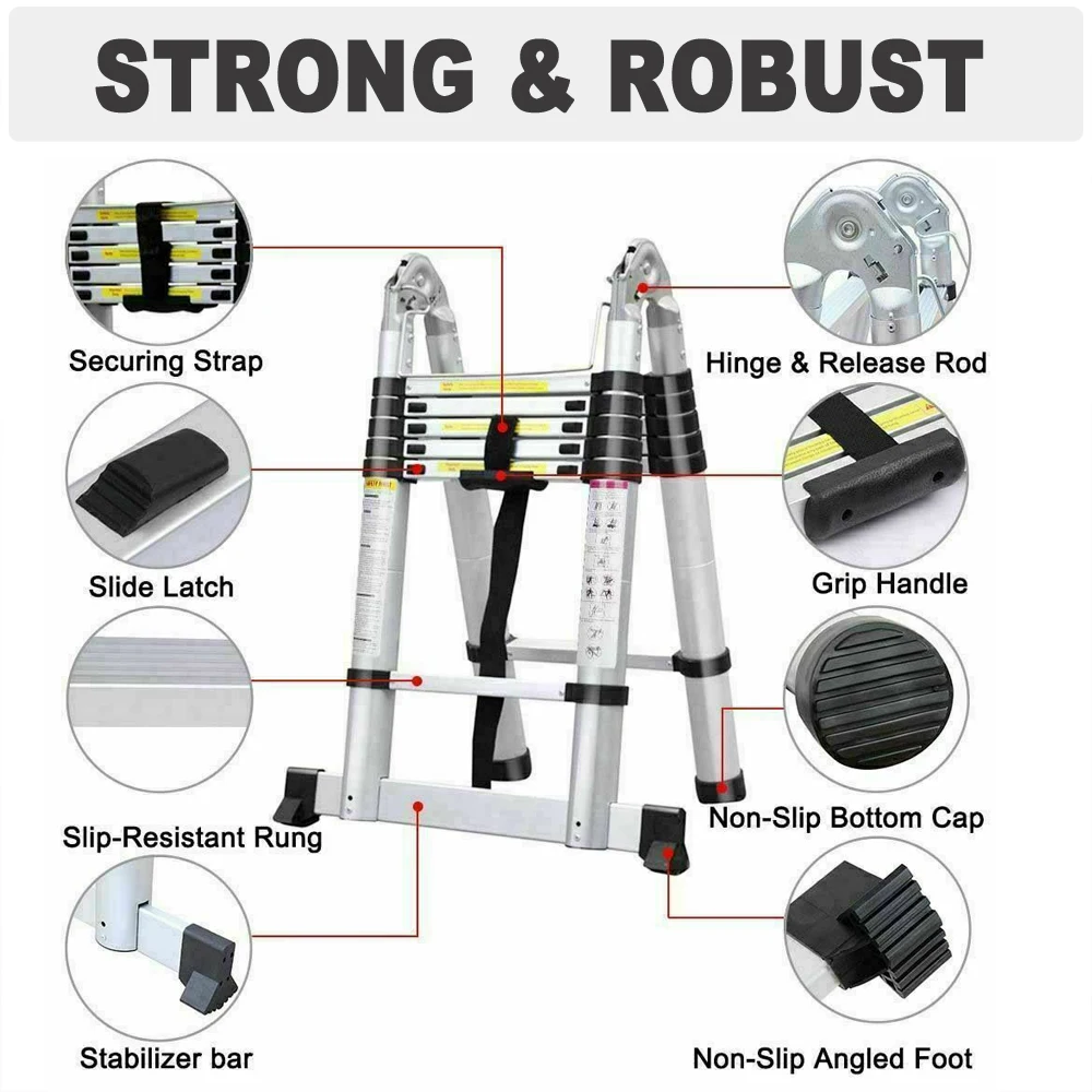 Discover the ultimate solution for your climbing needs with the 3.8 m / 5 m Folding Telescopic Ladder A-Frame. Designed for both professional and home use, this ladder offers outstanding stability, safety, and portability. Whether you are working on a construction project, performing maintenance, or reaching high shelves, this ladder adapts seamlessly to your requirements.