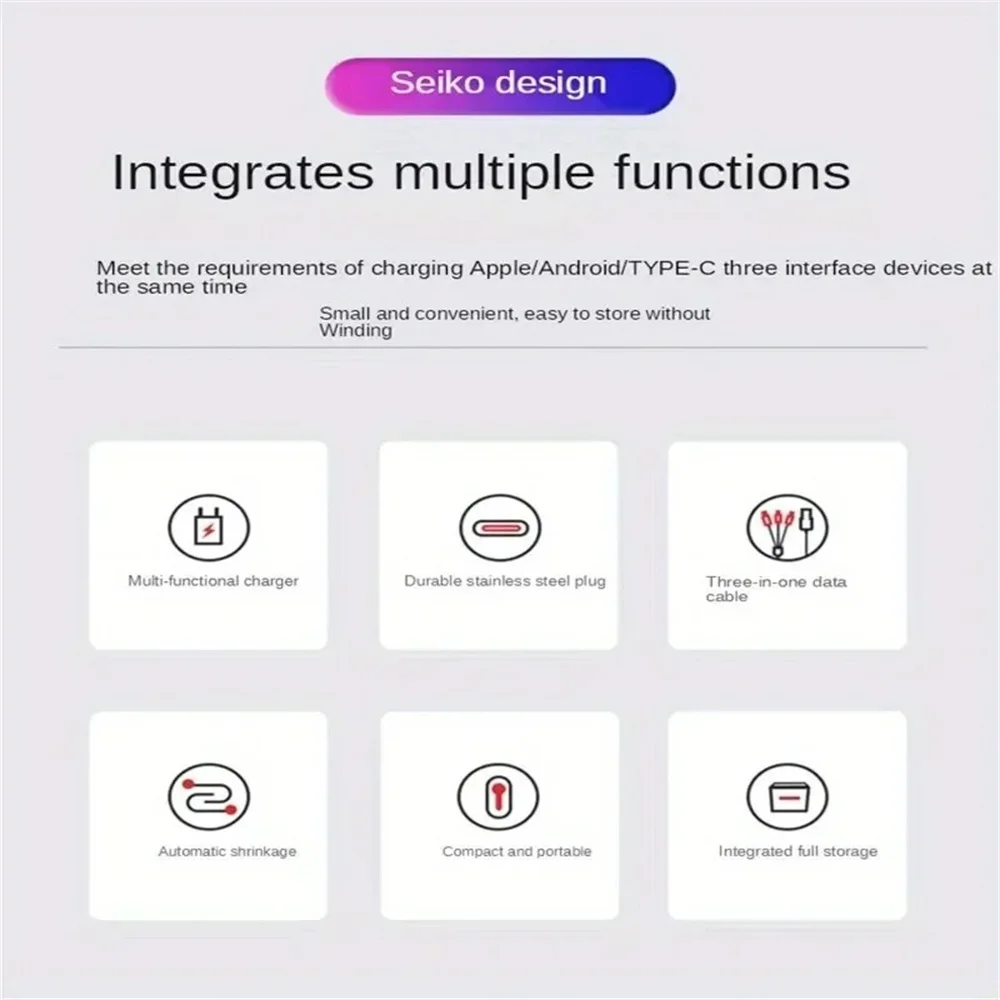 Experience fast, versatile charging with the 3-in-1 retractable USB cable. Compatible with iPhone, Type-C, and Micro USB devices, it offers a convenient 1m length and durable design. Available in six colors, it’s perfect for on-the-go charging and data transfer.