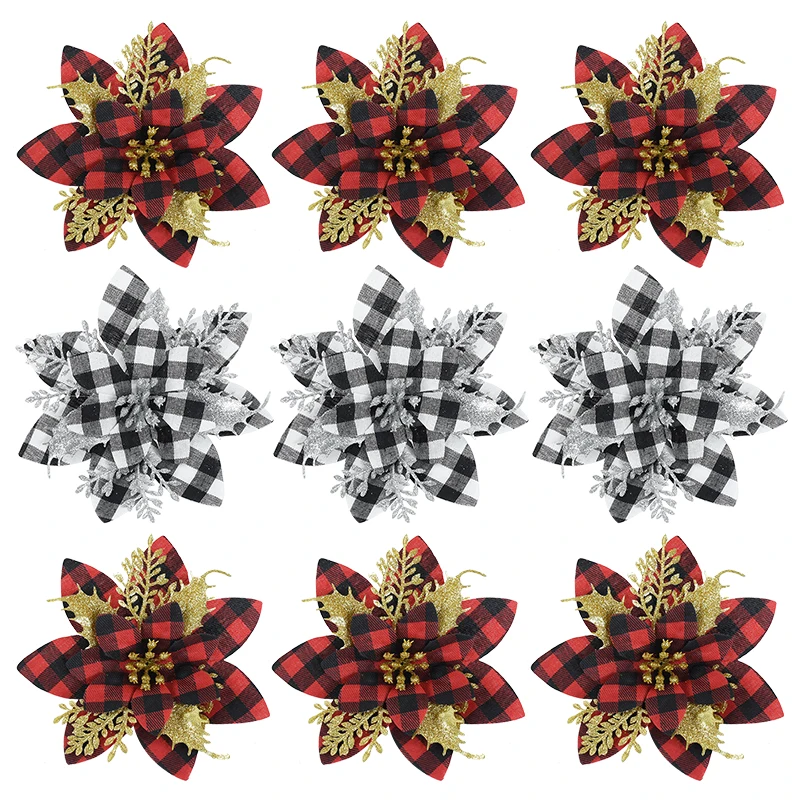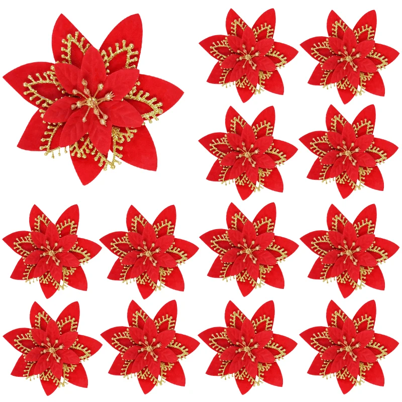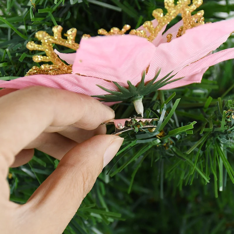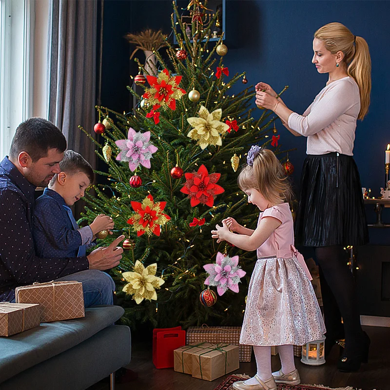 These artificial Christmas flowers offer a sophisticated and effortless way to enhance your holiday decor. Their glittering surfaces add an instant touch of glamour, making your tree the centerpiece of your festive celebrations. They are incredibly easy to use; simply attach them to your tree branches to fill empty spaces, add pops of color, and create a cohesive, professional-looking display. Beyond the Christmas tree, these versatile ornaments can be incorporated into various other holiday decorations. Adorn your mantelpiece, use them to embellish gift wrapping, or incorporate them into DIY craft projects for a truly personalized touch. They are perfect for creating a warm and inviting atmosphere for family gatherings, holiday parties, and quiet evenings by the fire.