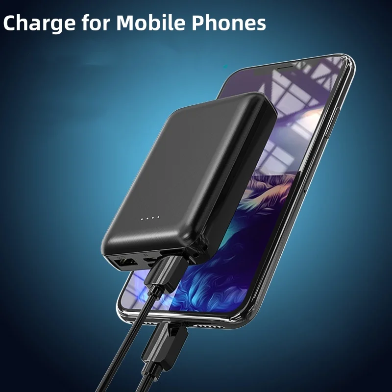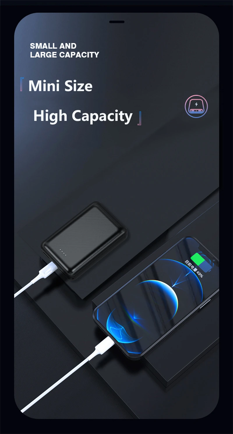 Stay powered on the go with this compact 5V 2A mini power bank featuring dual USB ports. Available in black and white, it offers 10000mAh or 20000mAh capacity to charge devices, run cooling fans, heated vests, and air conditioning units efficiently. Perfect for iPhone, Xiaomi, and more.