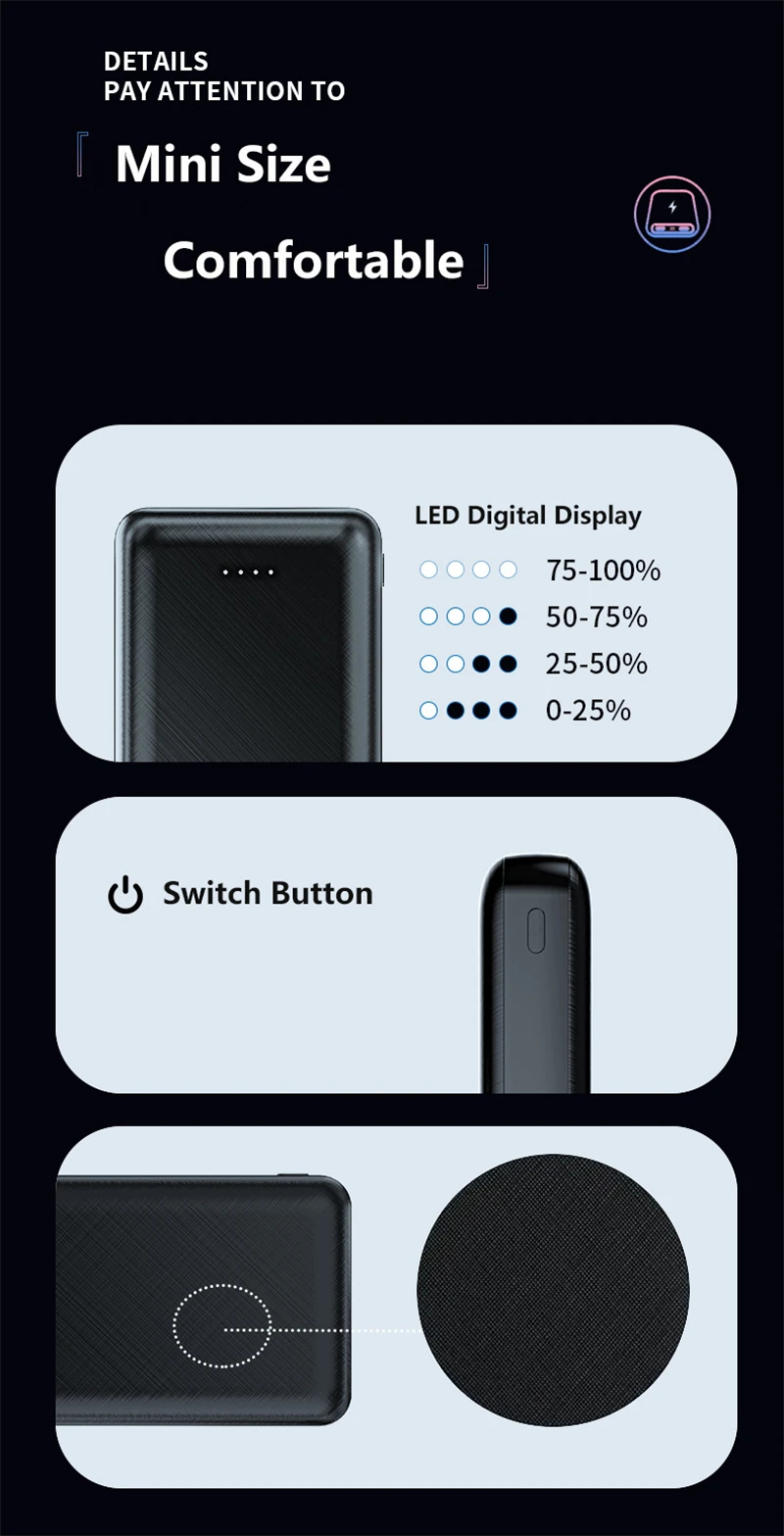 Crafted from high-quality materials, the power bank offers durability and heat resistance for safe and reliable operation. To maintain optimal performance, charge the power bank fully before first use and avoid exposure to extreme temperatures. Its compact form factor and modern design make it a practical accessory for everyday use and emergency power backup.