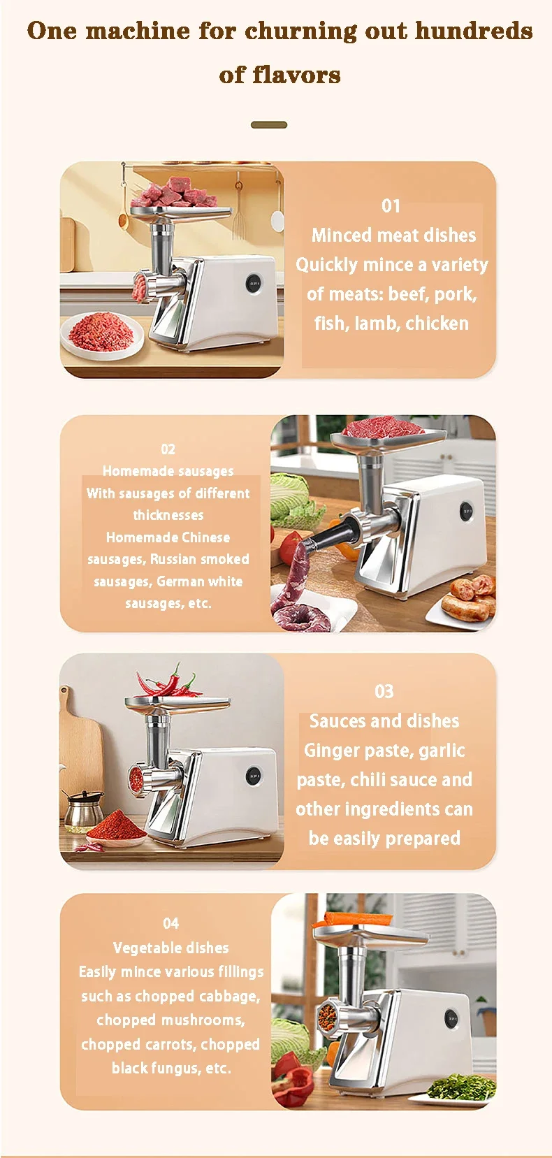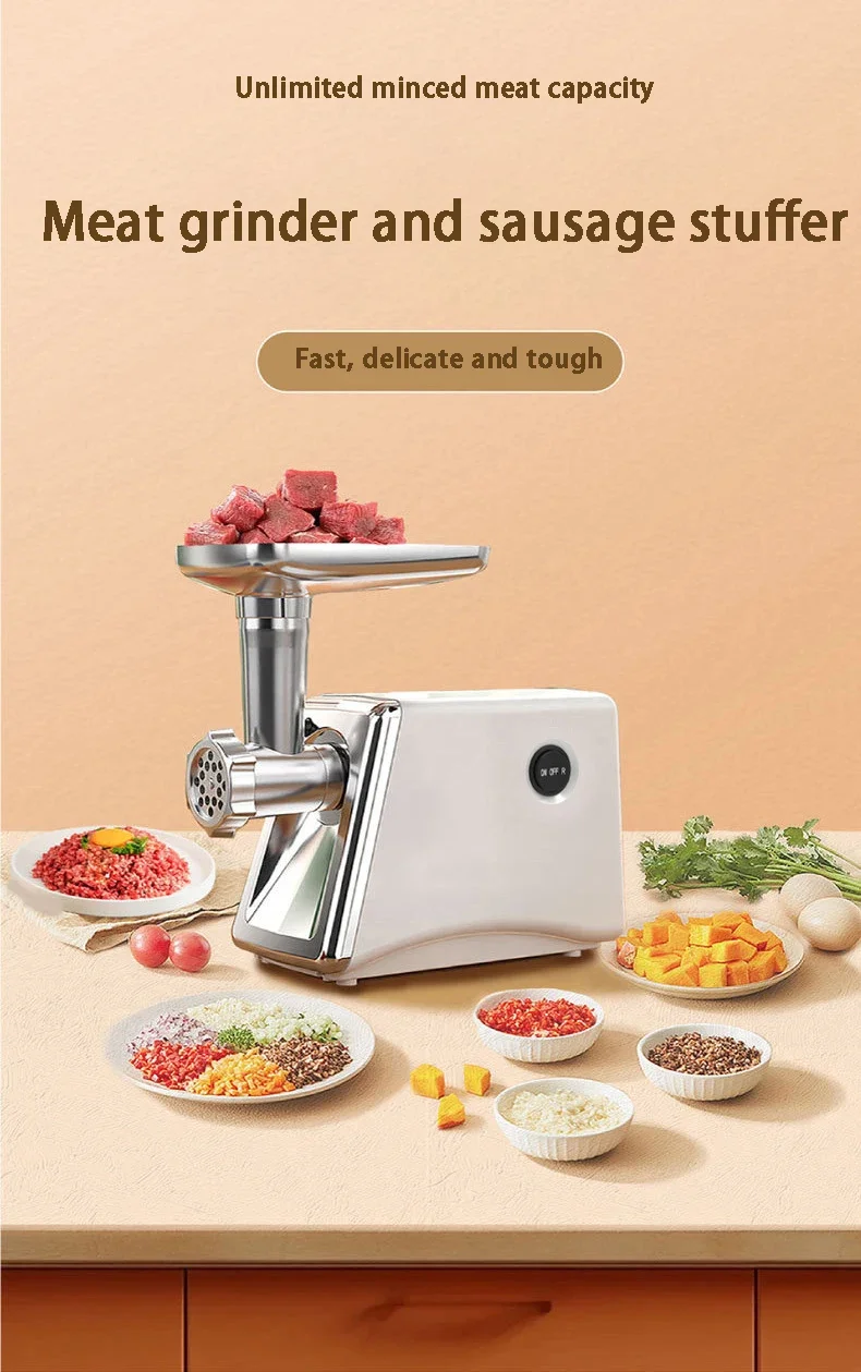 This electric meat grinder is an indispensable tool for home cooks, butchers, and anyone passionate about fresh, high-quality ingredients. Achieve superior flavor and texture in your burgers, meatballs, and other ground meat dishes by grinding your own meat. Experiment with homemade sausages, controlling the ingredients and spices for perfectly seasoned results. Beyond meat, this appliance acts as a capable food processor, saving you time and effort in chopping vegetables for stews, soups, or salsas, and even grinding nuts for baking or pestos. Its user-friendly design makes it accessible for both novice and experienced cooks, providing a professional-grade experience in the comfort of your home.