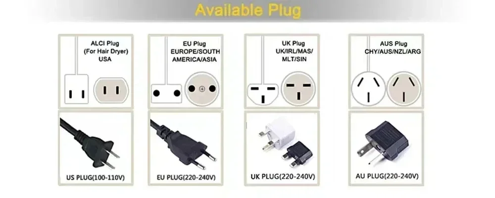 – Available Plug Types: AU, EU, and UK plug options to suit your region.