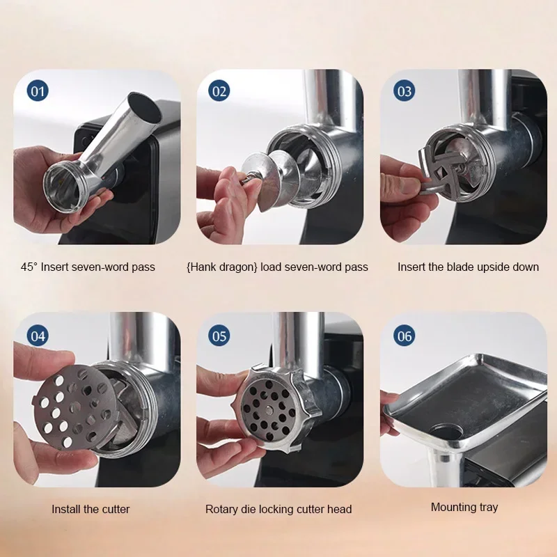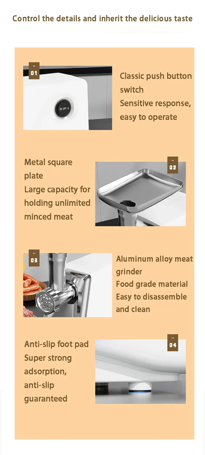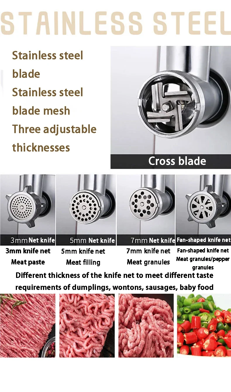 Crafted from high-quality, food-grade materials, this meat grinder and food processor prioritizes both performance and safety. Ensure all parts are thoroughly cleaned after each use to maintain hygiene and prolong the life of the appliance. Refer to the user manual for detailed assembly, operation, and cleaning instructions. Experience the difference that fresh, home-processed ingredients can make to your meals.