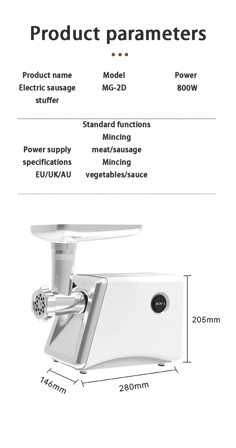 Transform your culinary creations with the 800W Heavy Duty Electric Meat Grinder and Food Processor. This powerful and versatile kitchen appliance is designed to simplify your food preparation, allowing you to grind fresh meats, create homemade sausages, and process a variety of food ingredients with unparalleled ease and efficiency. Say goodbye to pre-ground meats and embrace the freshness and control that comes with grinding your own.