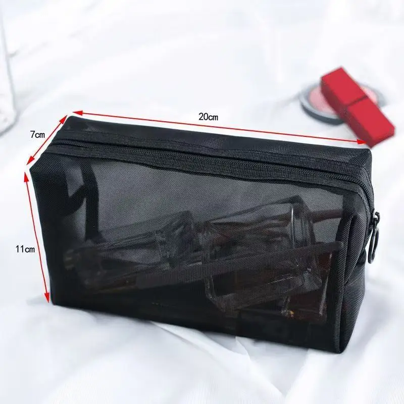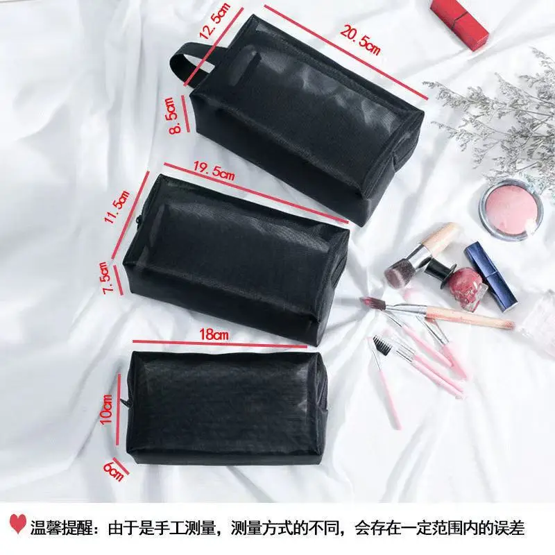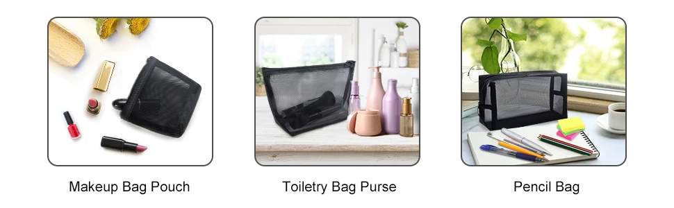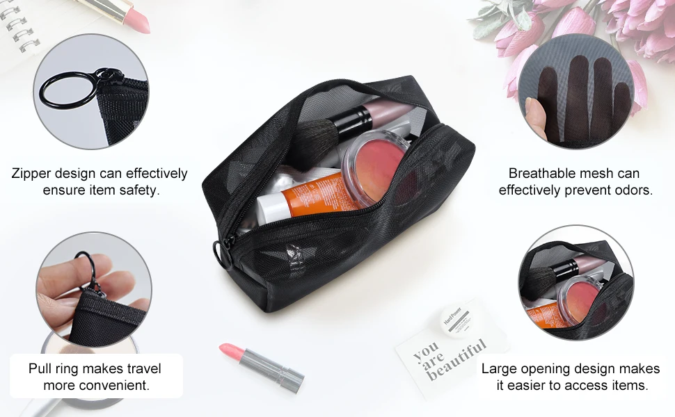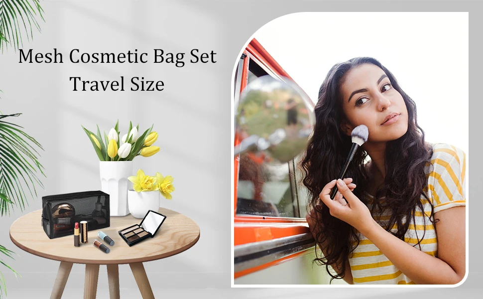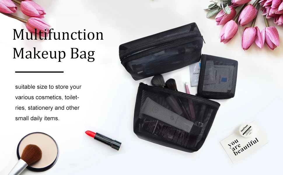 - Three mesh cosmetic bags in varying sizes for versatile storage options