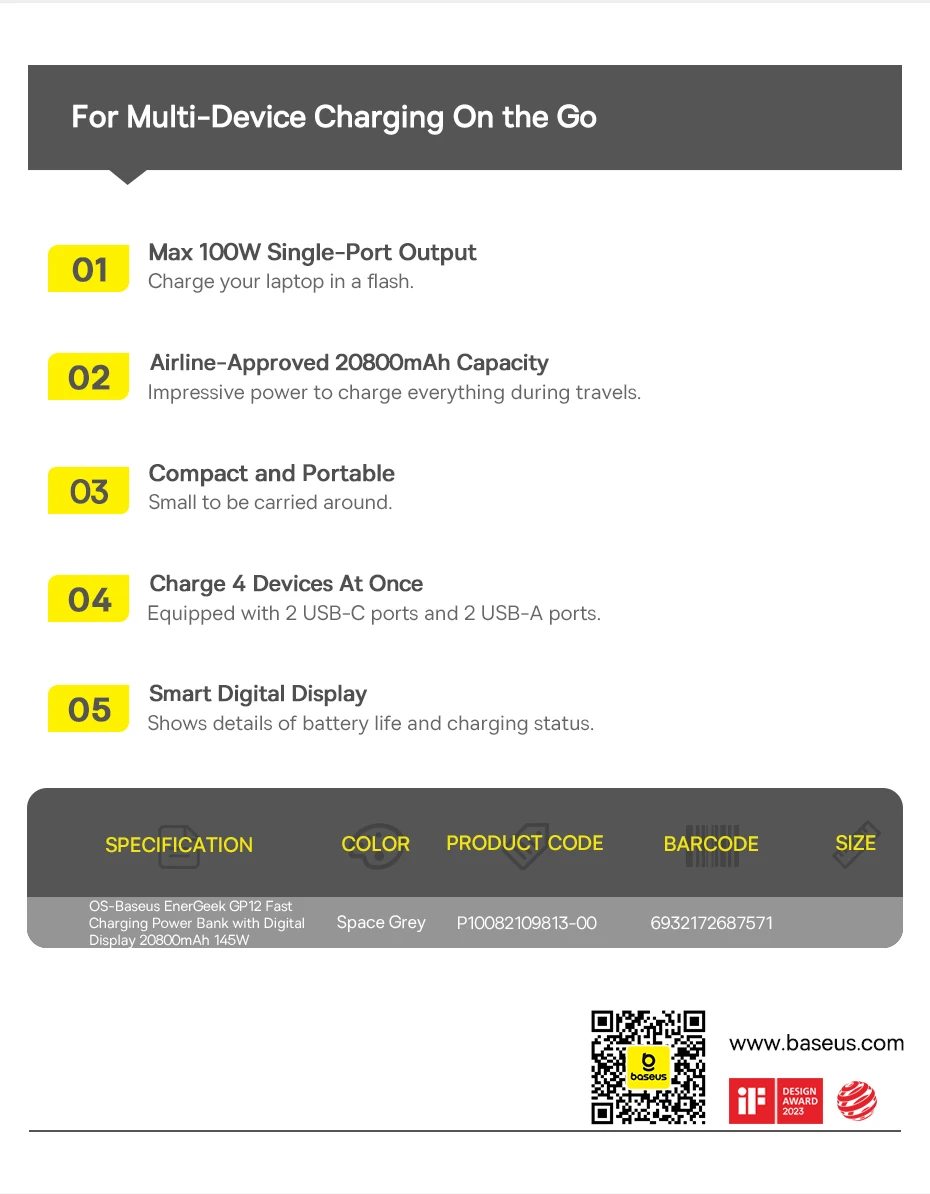 Experience the freedom of reliable, fast charging with the Baseus 145 W Power Bank – your ultimate power companion for all your electronic devices.