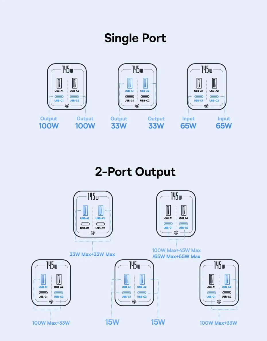 – Dual USB-A ports and one USB-C port support simultaneous charging of multiple devices.
