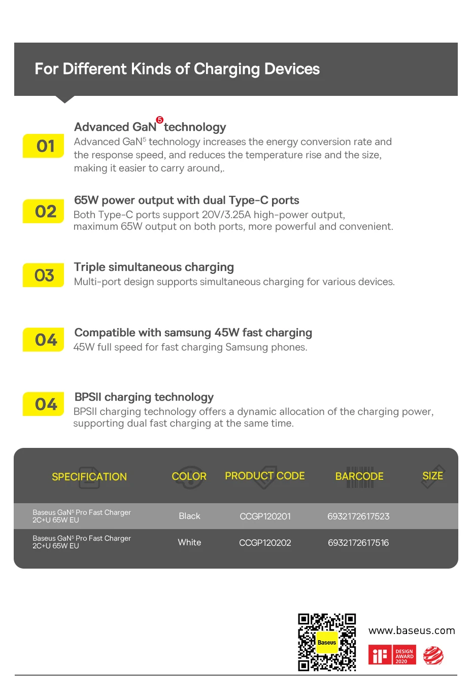 Experience rapid and reliable charging with the Baseus 65W GaN Charger, designed to meet the demands of modern electronics. This compact and portable charger delivers high-speed power to laptops, iPhones, and a wide range of USB-C devices, ensuring your gadgets stay powered throughout the day. Its advanced GaN technology offers superior efficiency and safety in a sleek, minimalist design.