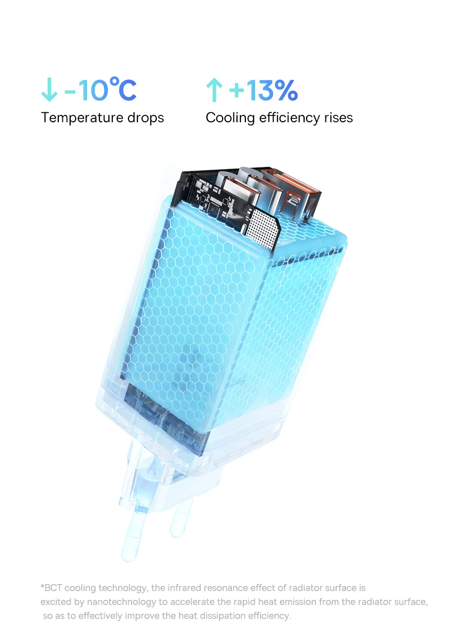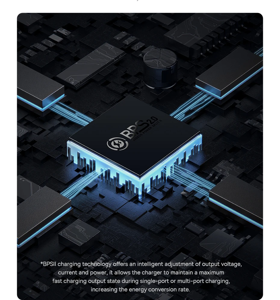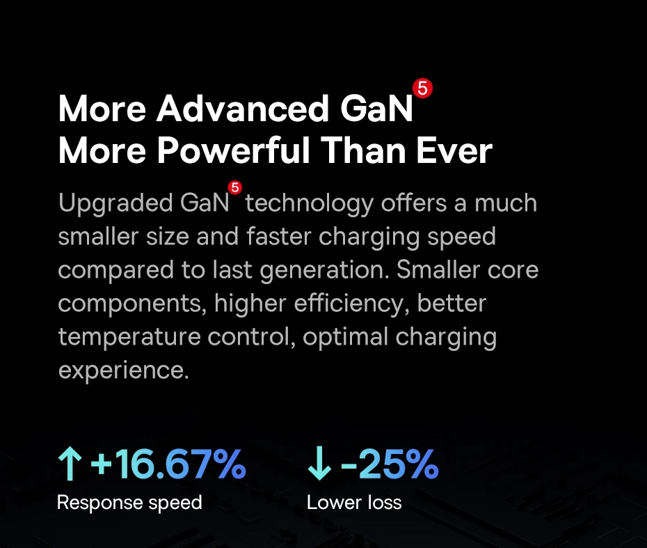 – Utilizes GaN (Gallium Nitride) technology for enhanced energy efficiency and reduced heat generation