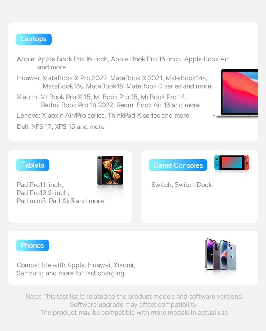 – USB Type-C port compatible with multiple devices including iPhone 13, 14, 15 Pro models and various laptops