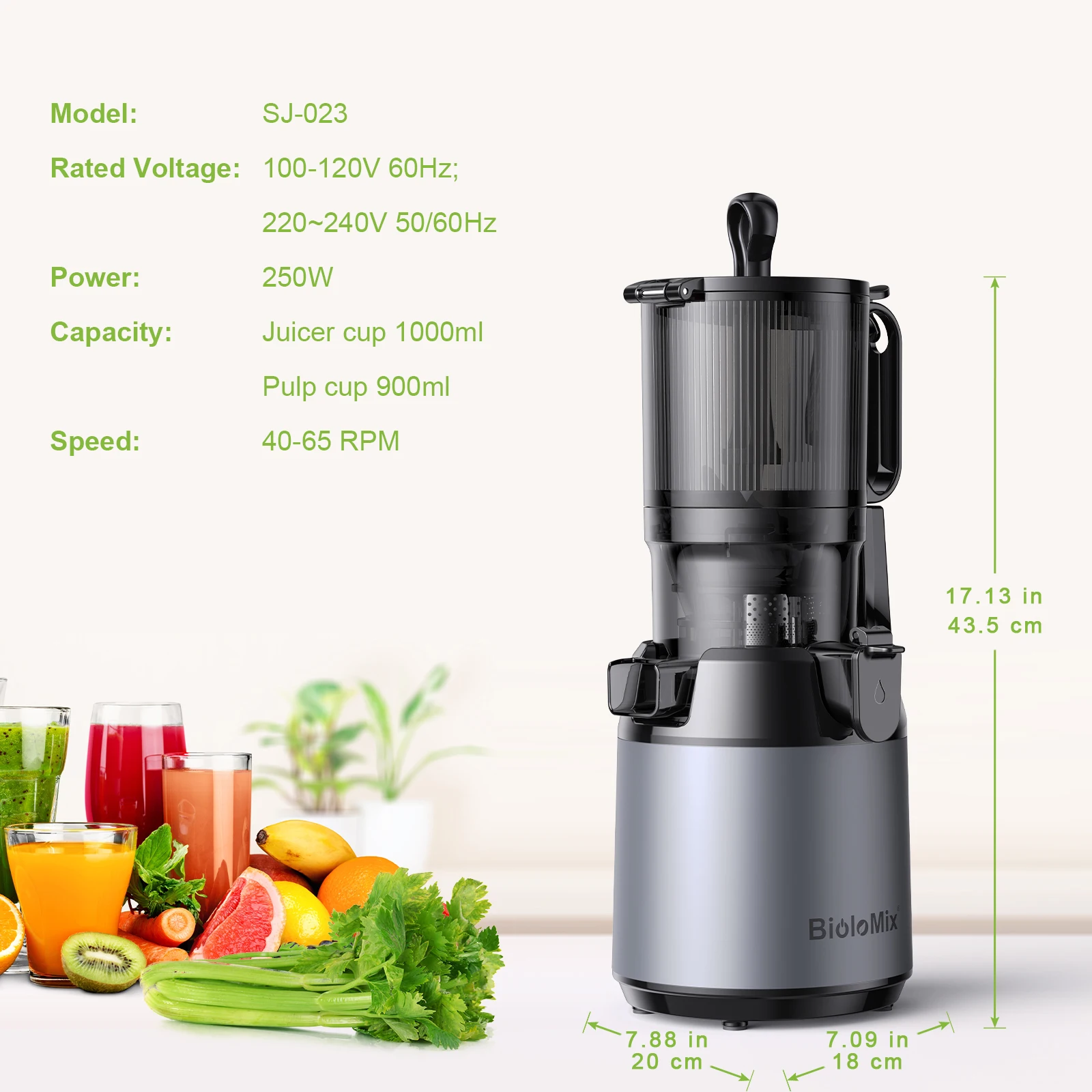 Whether you’re looking to boost your immune system, increase your energy levels, or simply enjoy a delicious and healthy beverage, the Biolo Mix Cold Press Juicer is the perfect solution. Easily create a variety of juices from leafy greens and hard vegetables to soft fruits and berries. The large feed chute reduces the need for pre-cutting, saving you valuable time and effort.