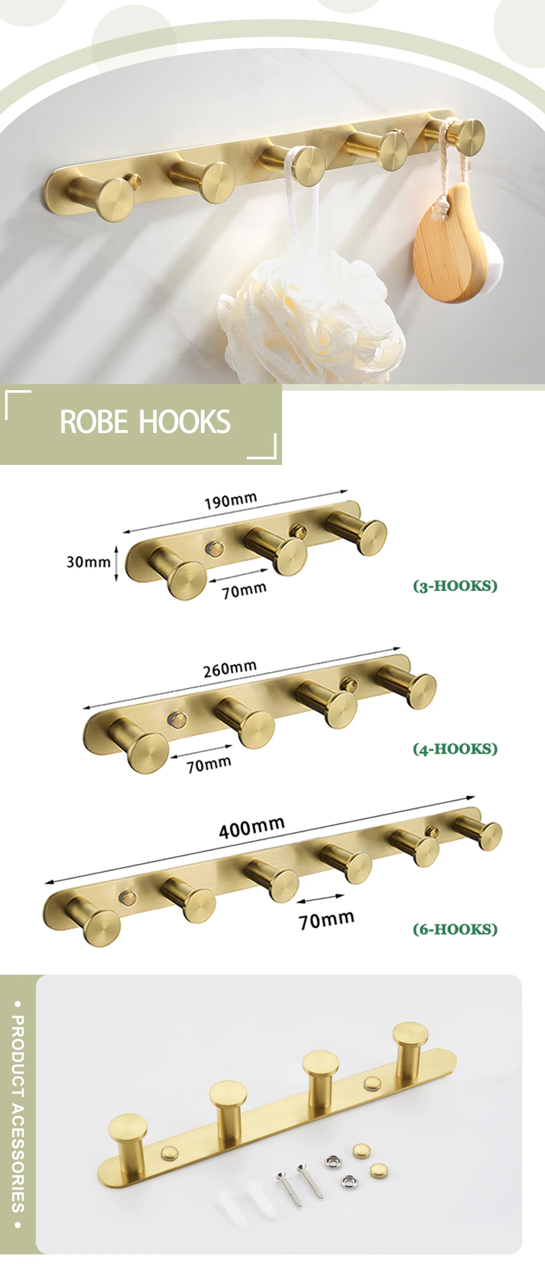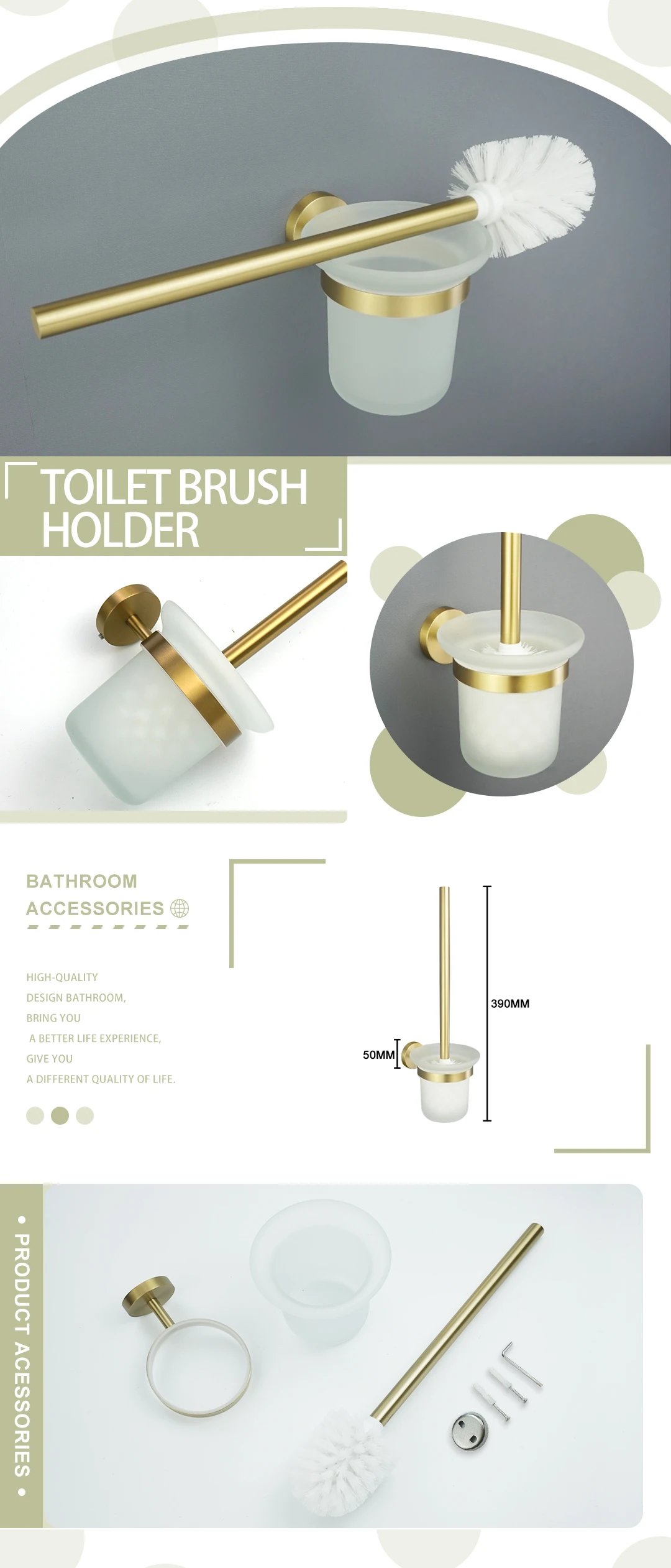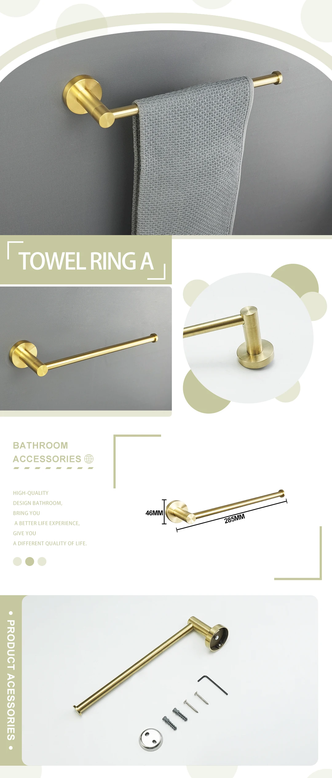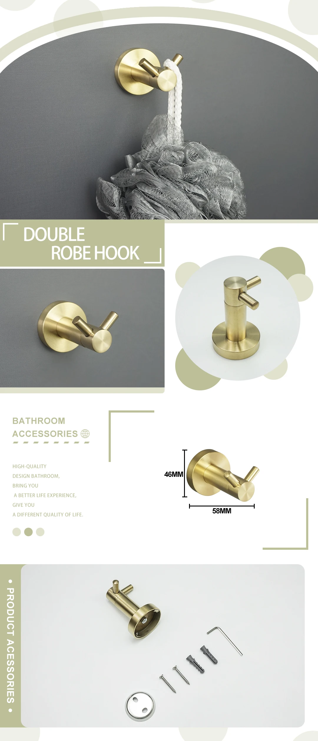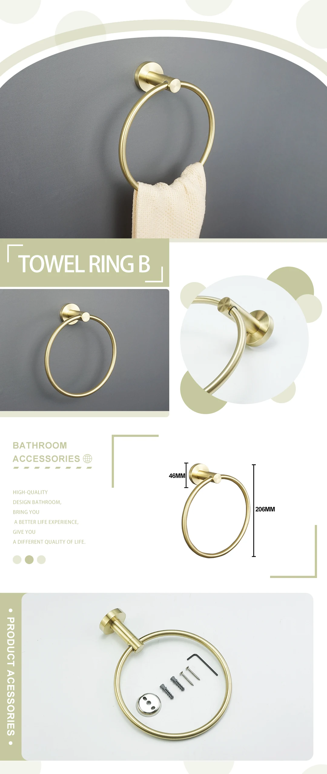 - Comprehensive Collection: Choose from a wide array of essential accessories including towel rings, towel bars (single and double), robe hooks, toilet brush holders, cup holders, soap dishes, and paper holders, available in various configurations to suit your needs.