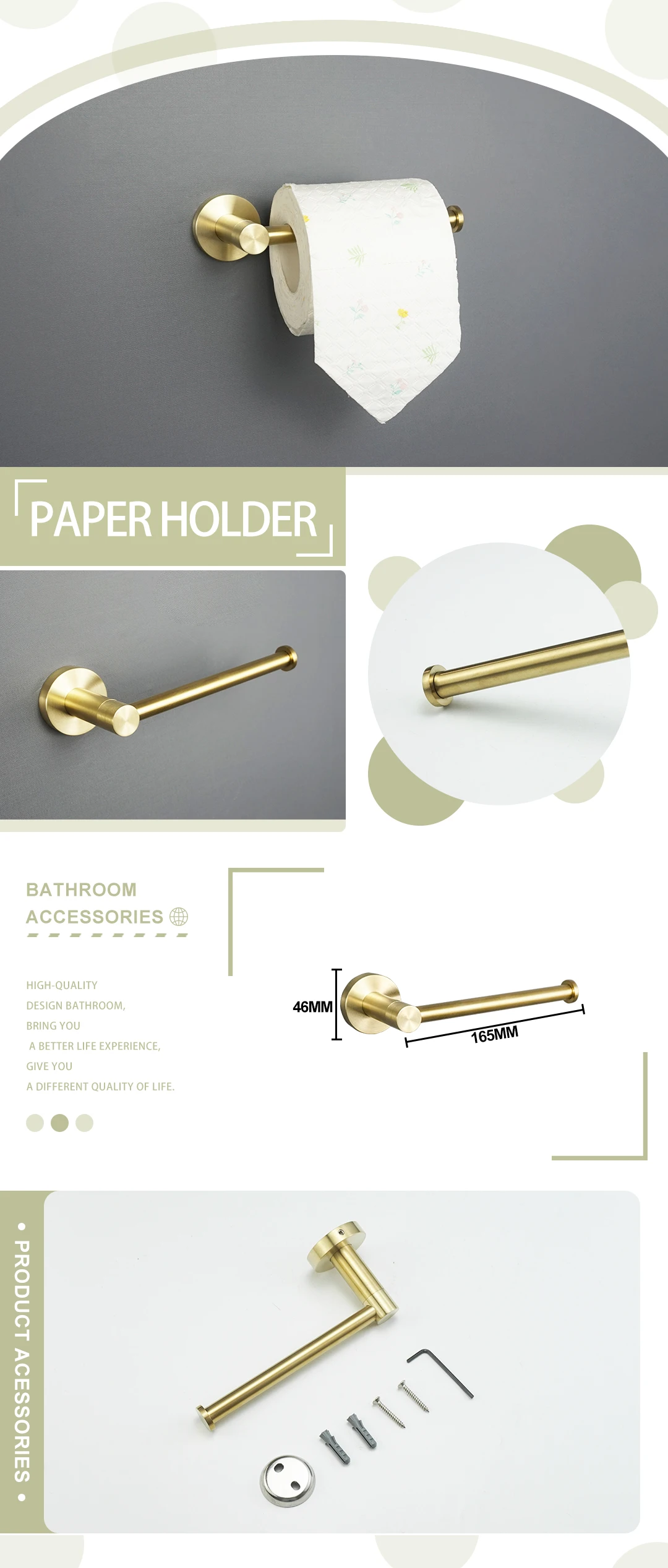 Introducing our exquisite collection of brushed gold bathroom accessories, meticulously designed to infuse your space with sophistication and unparalleled functionality. From the essential paper holder to the luxurious towel bar and practical robe hooks, each piece is crafted to enhance your daily routine while adding a touch of refined glamour to your bathroom decor. Transform your ordinary bathroom into an extraordinary sanctuary of style and order.