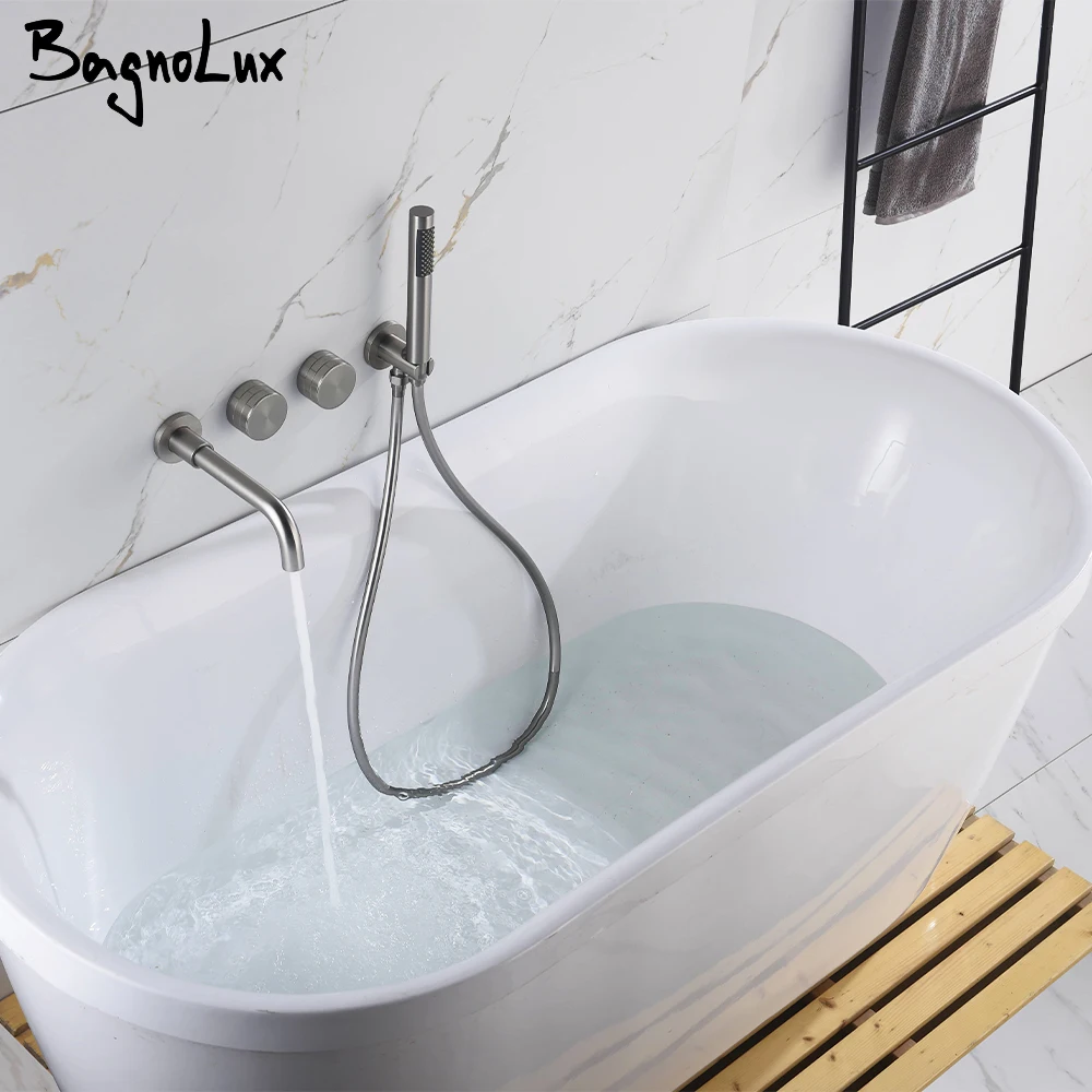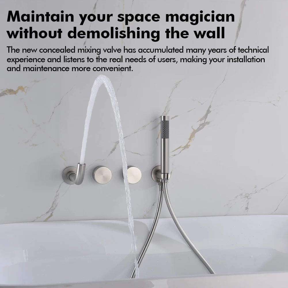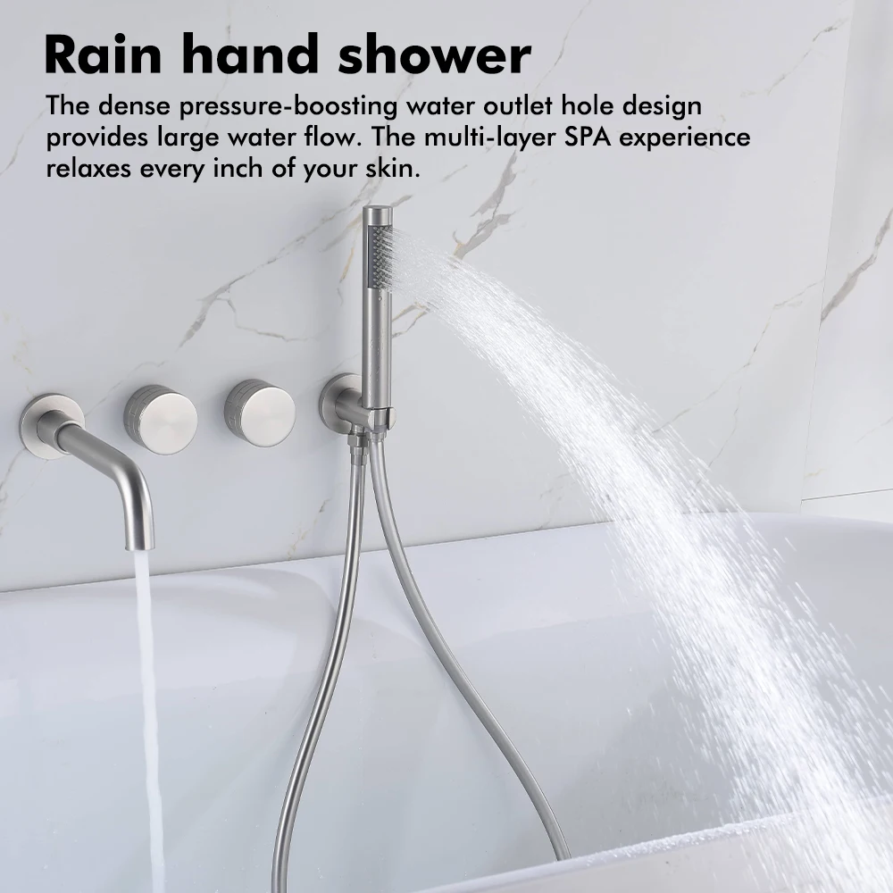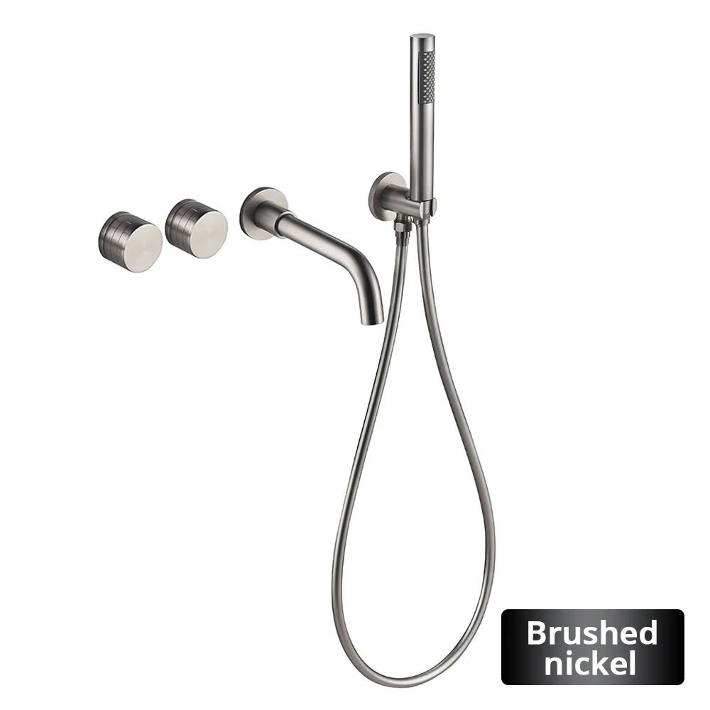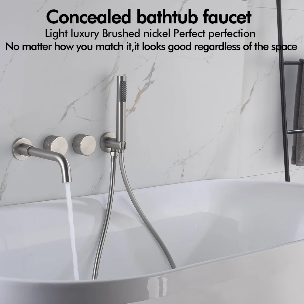 Transform your bathroom into a spa-like sanctuary with this exquisite Brushed Nickel Bathtub Tap system. Designed for both aesthetic appeal and unparalleled functionality, this wall-mounted faucet seamlessly integrates a luxurious bathtub spout with a convenient handheld shower, offering a complete and versatile bathing solution. Experience the perfect blend of modern design and practical utility, crafted to enhance your daily routine.