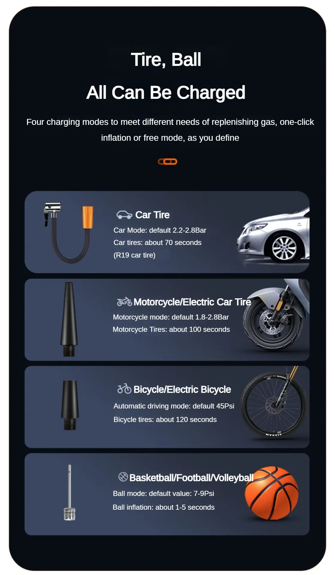 This wireless air compressor empowers you to maintain optimal tire pressure effortlessly, enhancing vehicle safety, fuel efficiency, and tire longevity. Its portability allows you to carry it on road trips, cycling adventures, or sports events, ensuring that you never face the inconvenience of a flat or underinflated tire. The electric operation means no manual pumping, saving time and energy. Ideal for inflating car tires, motorcycle tires, bicycle tires, and various balls, this pump is a versatile companion for everyday needs and emergencies.