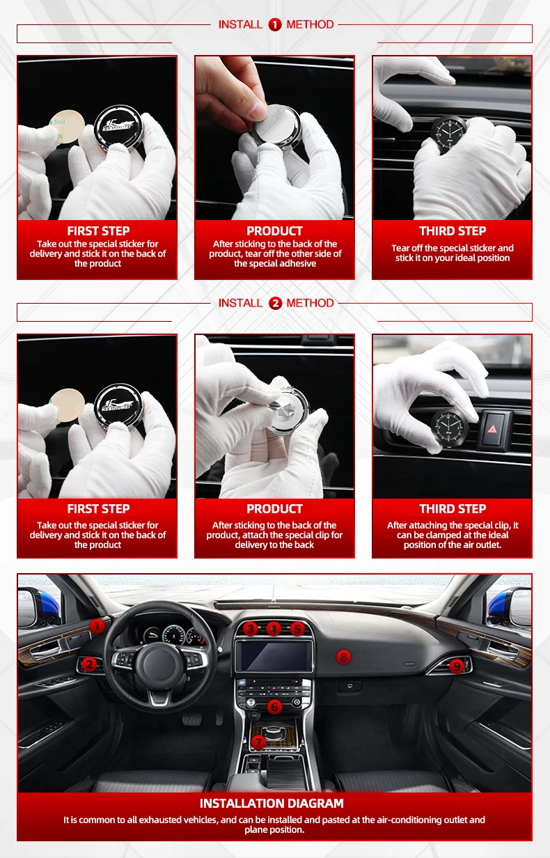 - Compact and Discreet Design: Measuring a mere 40mm, this mini clock fits unobtrusively onto your dashboard, console, or any preferred surface.