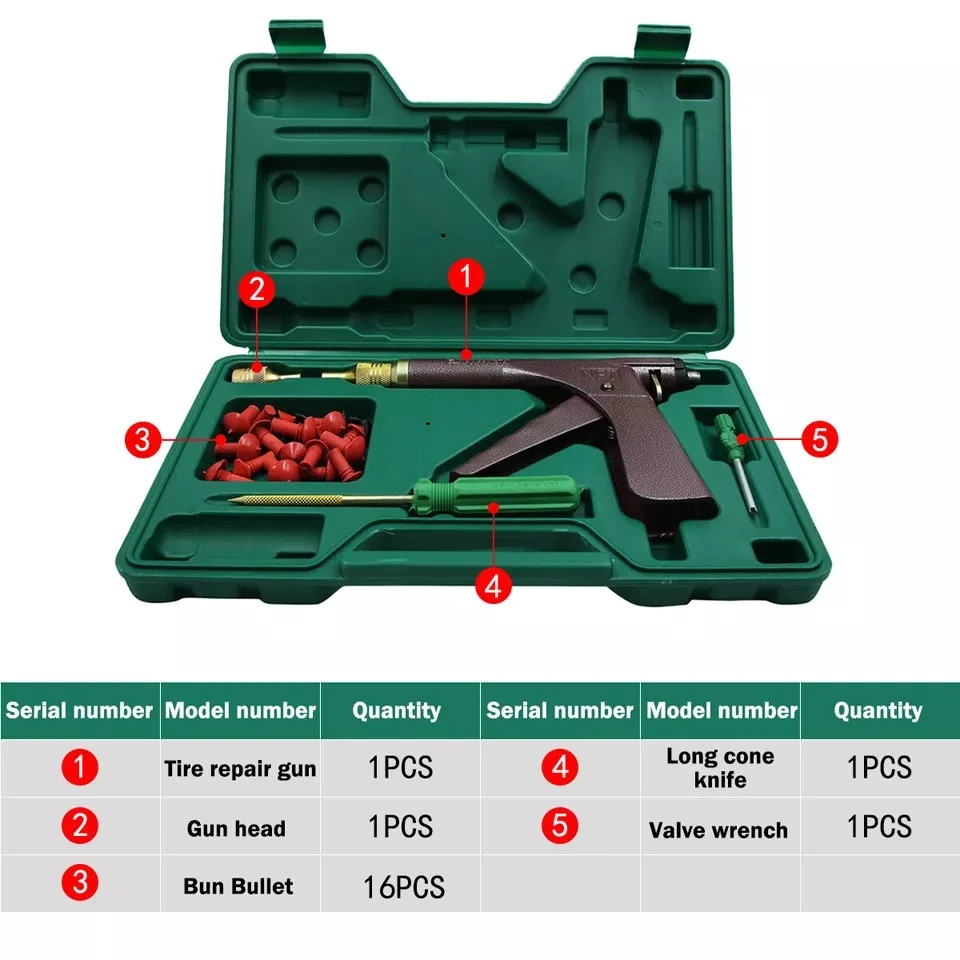 – Complete professional repair kit including a vacuum tire repair gun for precise and clean puncture sealing