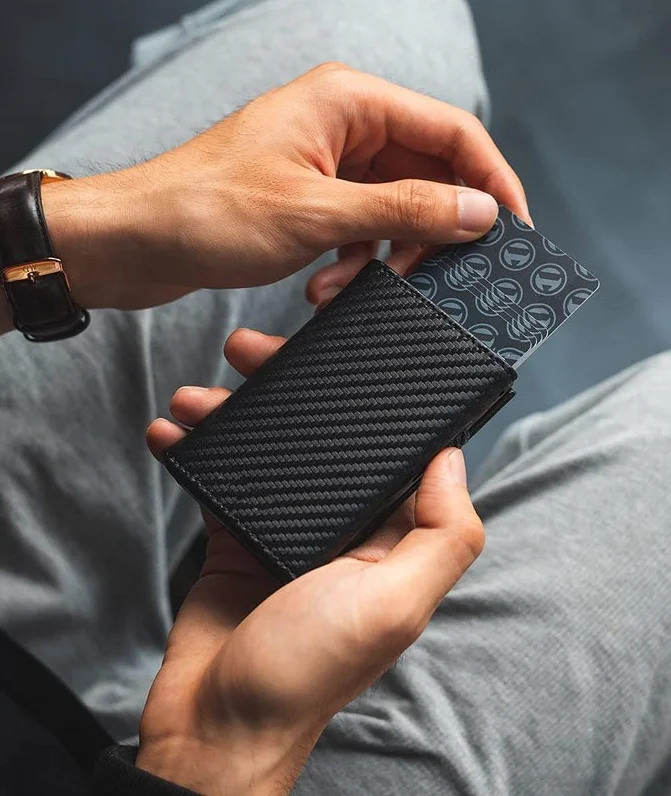 Crafted from high-quality carbon fiber and aluminum, this wallet offers exceptional durability and resistance to wear and tear. To maintain its pristine condition, gently wipe the surface with a soft cloth and avoid exposure to extreme moisture. This wallet is the ultimate fusion of technology, design, and practicality—perfect for the discerning individual who values security and style in one compact accessory.