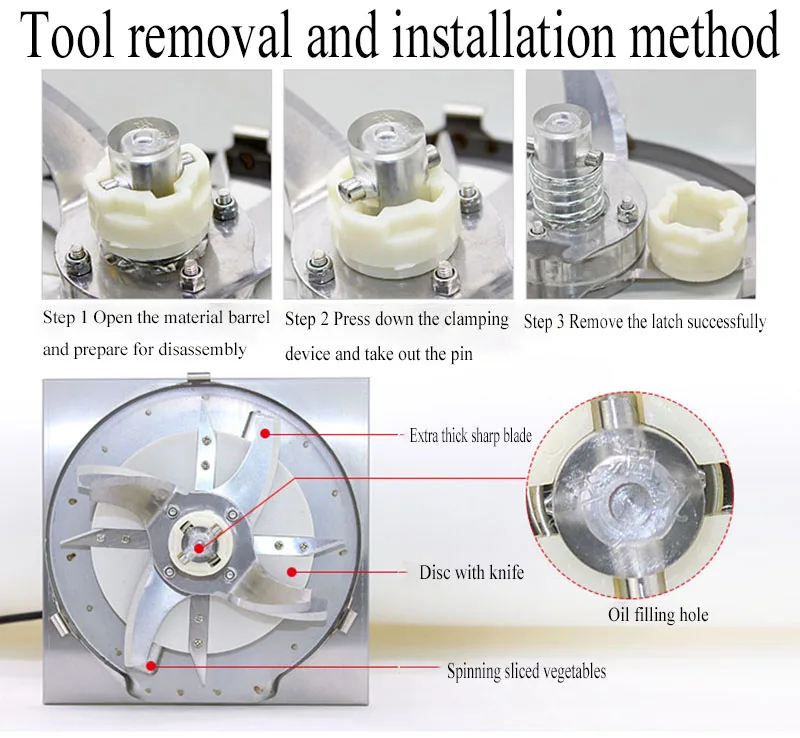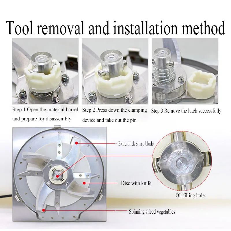 Constructed from premium, food-safe materials, this vegetable chopper is built to withstand the rigors of daily commercial use while maintaining the highest standards of hygiene. The robust stainless steel blades are sharp and durable, offering exceptional performance and longevity. Cleaning is a breeze thanks to its thoughtful design, which allows for easy access to all components for thorough washing. Simply detach the relevant parts, wash them with warm soapy water, and reassemble. This machine is designed for reliability, efficiency, and ease of use, making it a smart investment for any food service professional.