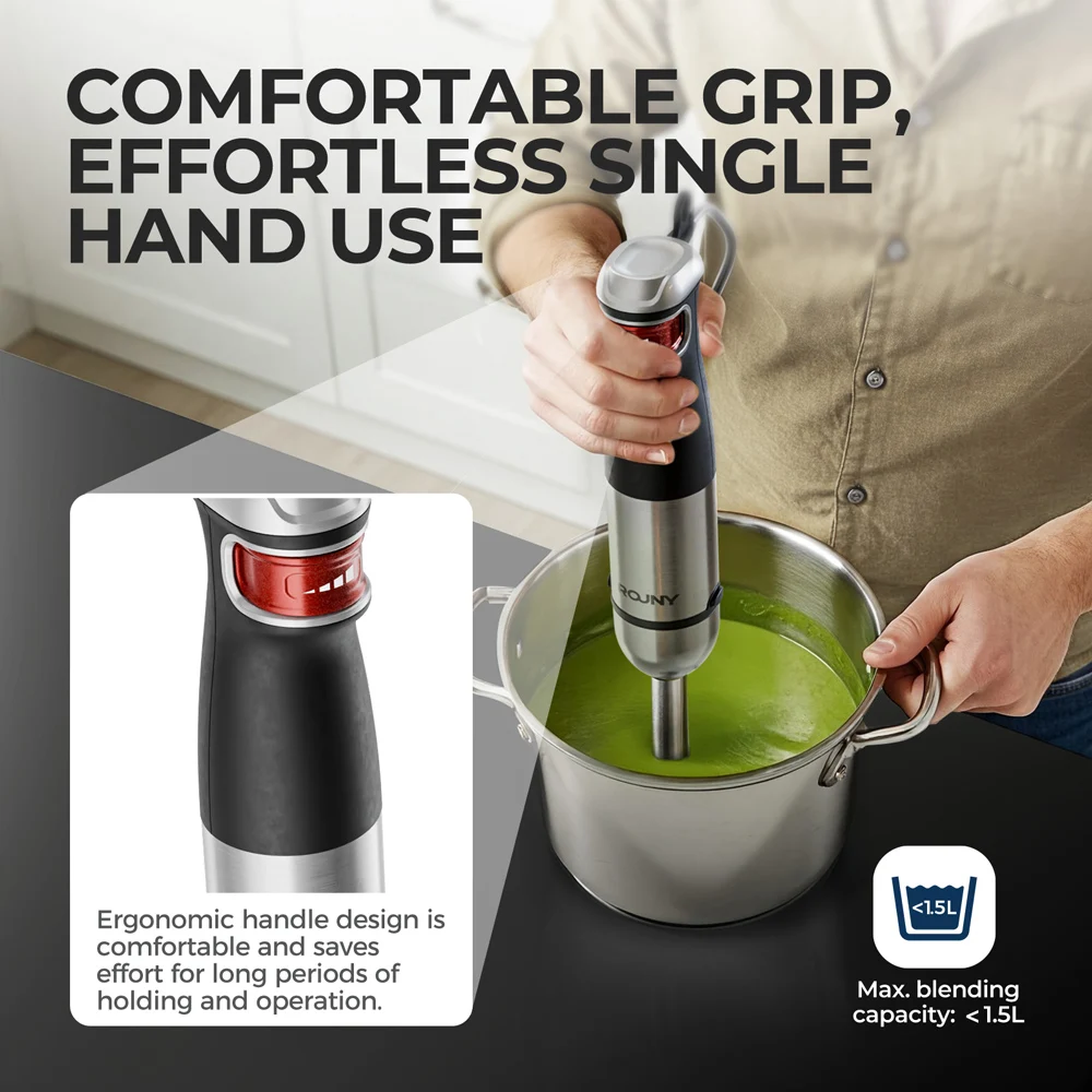 Discover the power and versatility of our Electric Hand Held Stick Blender, a must-have kitchen companion designed to simplify food preparation and elevate your culinary creations. This 6-in-1 multi-purpose immersion hand blender combines exceptional performance with unmatched convenience, making it perfect for both novice cooks and seasoned chefs. With its robust 1500W motor and durable stainless steel blades, this blender effortlessly tackles a wide range of tasks, from blending soups and sauces to whipping cream and chopping vegetables.