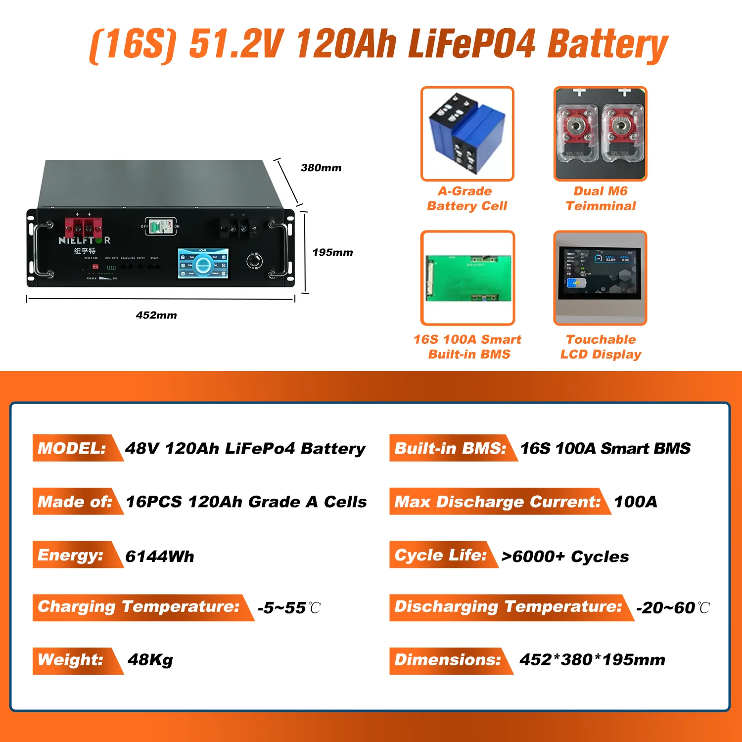 – Built-in 200 A Battery Management System (BMS) ensures protection against overcharge, over-discharge, short circuit, and temperature extremes