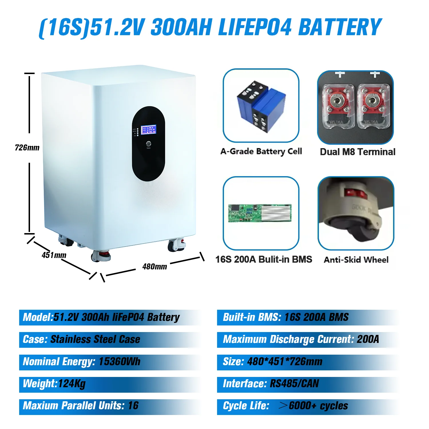 – Voltage options: 51.2 V with capacities of 100 Ah, 120 Ah, 200 Ah, and 300 Ah, enabling flexible system sizing