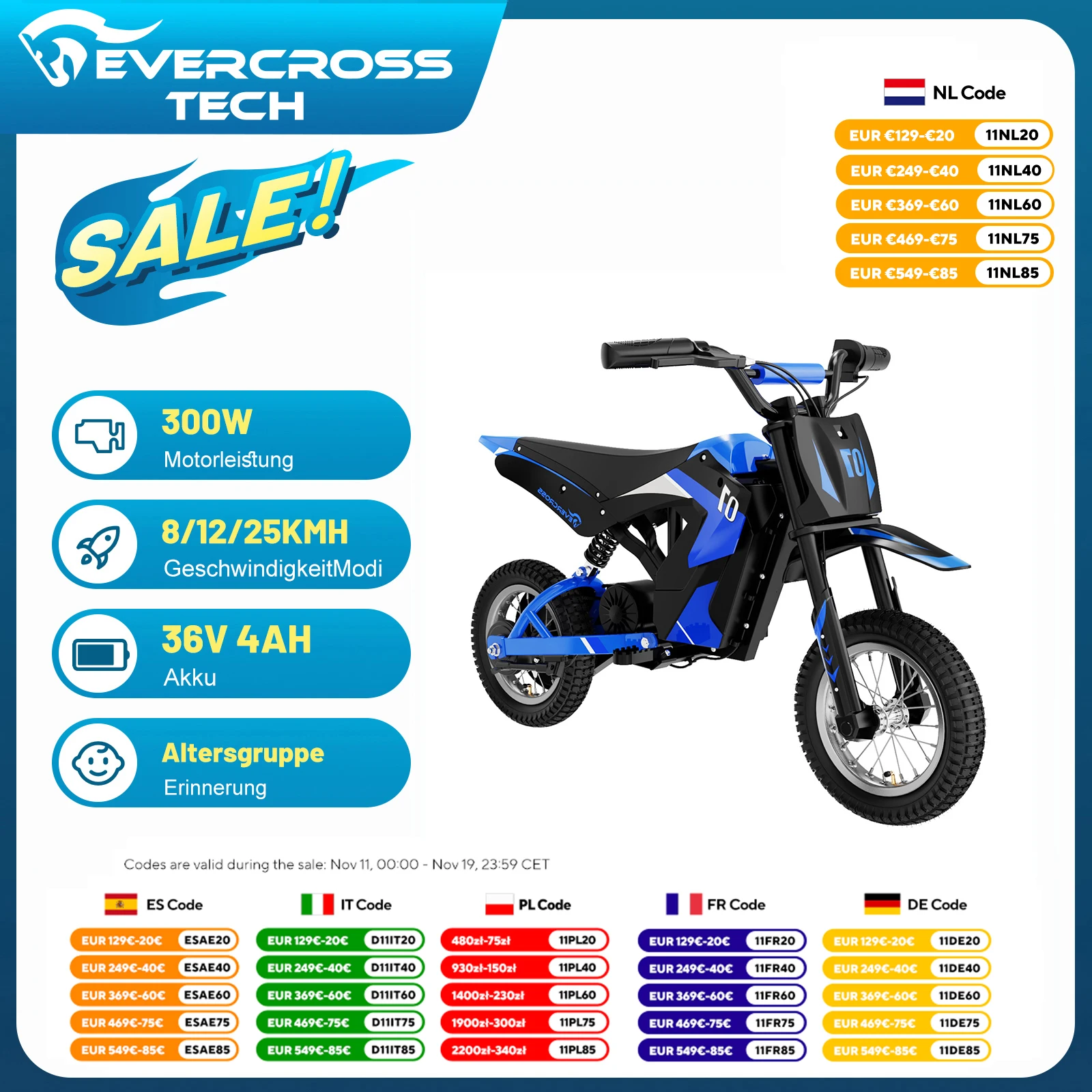 EVERCROSS TECH EV12 children's electric motorbike features a powerful 300W M-motor, reaching speeds up to 25 km/h. With 15 km autonomy and durable 12-inch tires, it offers thrilling rides and reliable performance. Available in red and blue, ships from Germany for fast delivery.