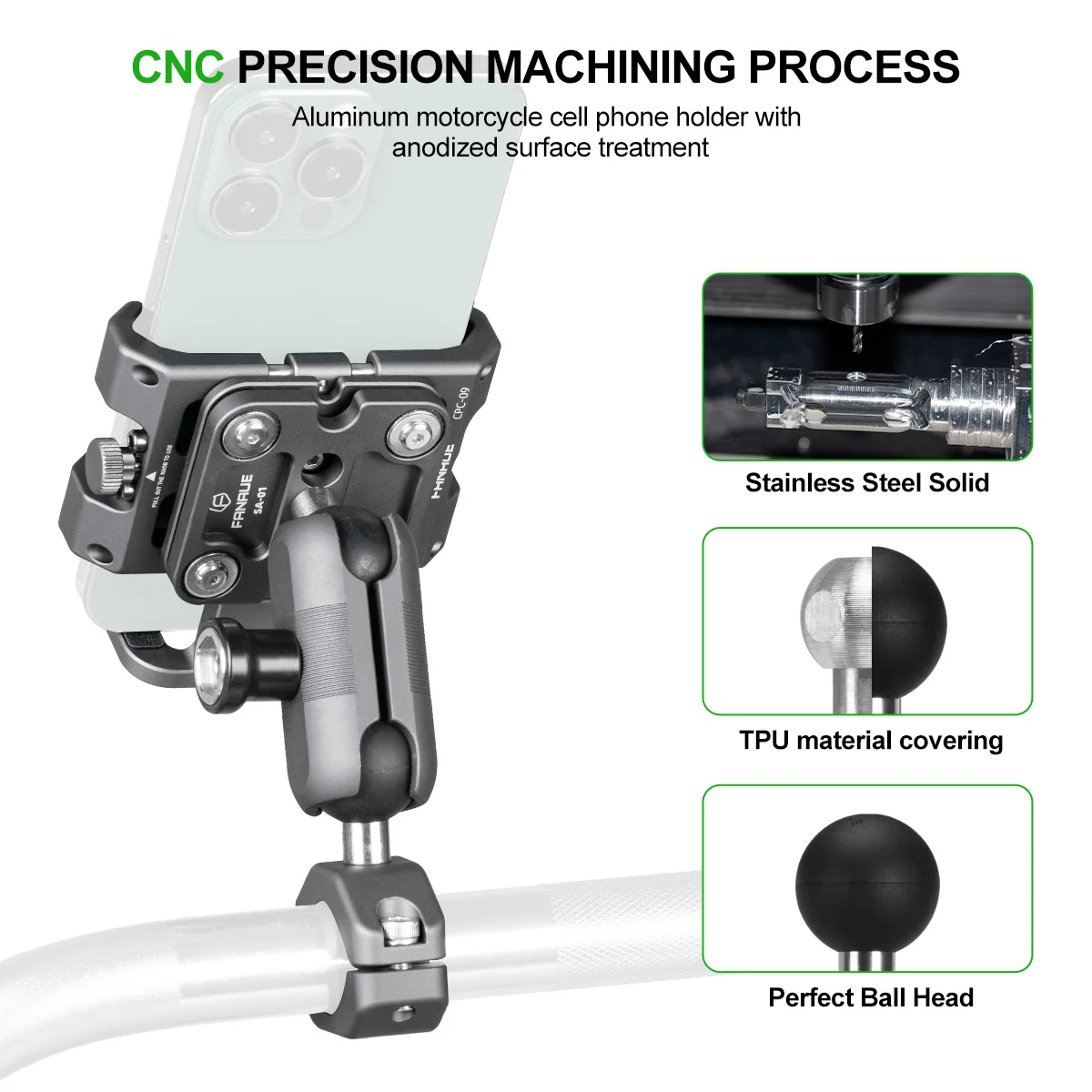 Upgrade your ride with the FANAUE Motorcycle Bike Phone Holder Mount – the perfect blend of strength, protection, and ease of use for your electronic devices.