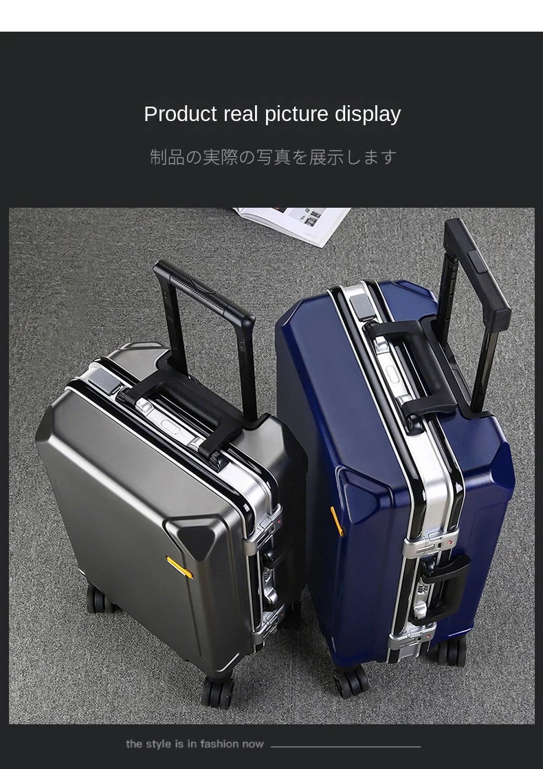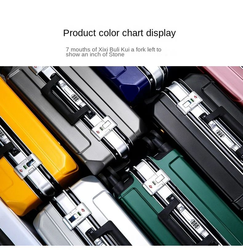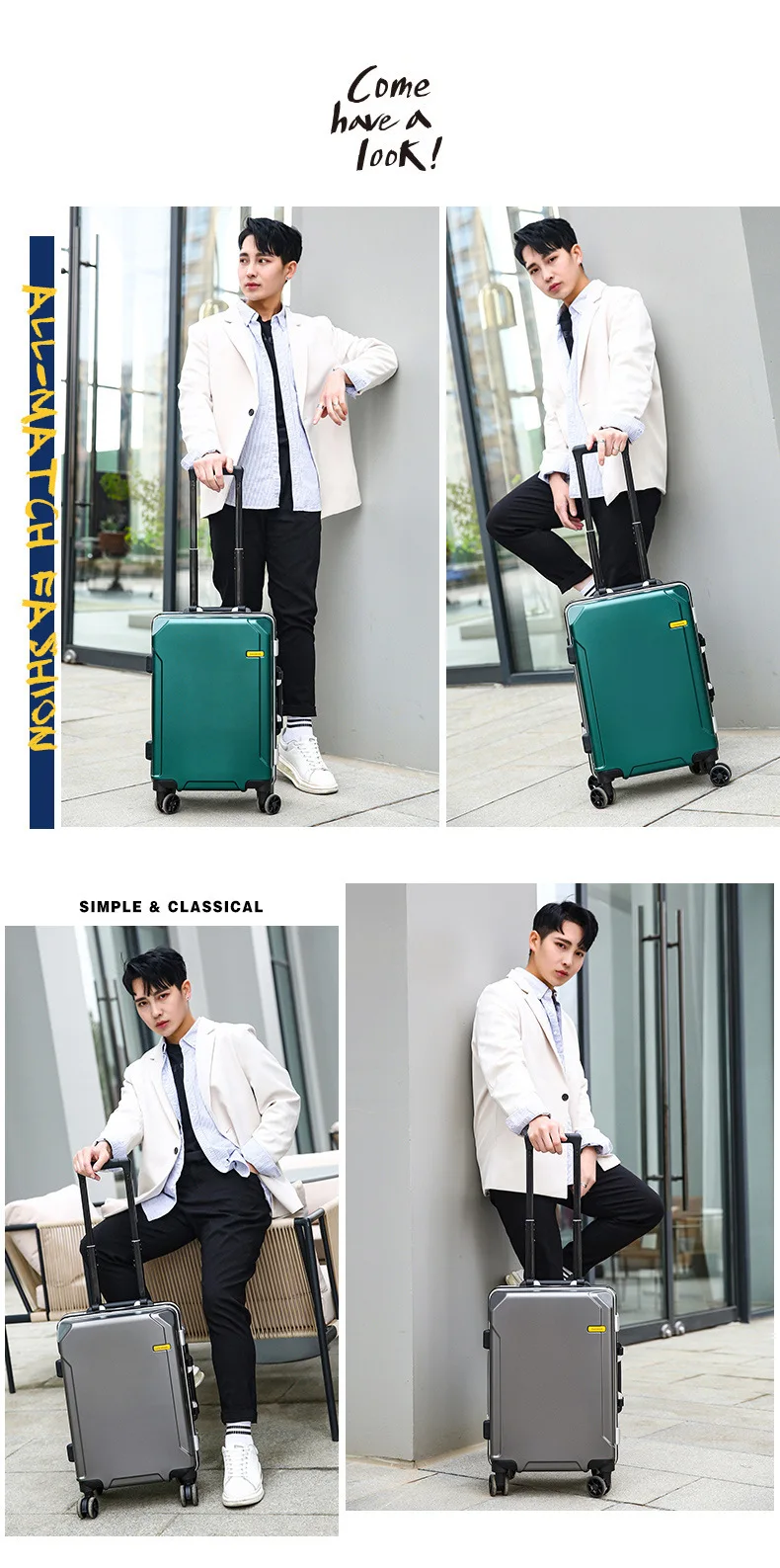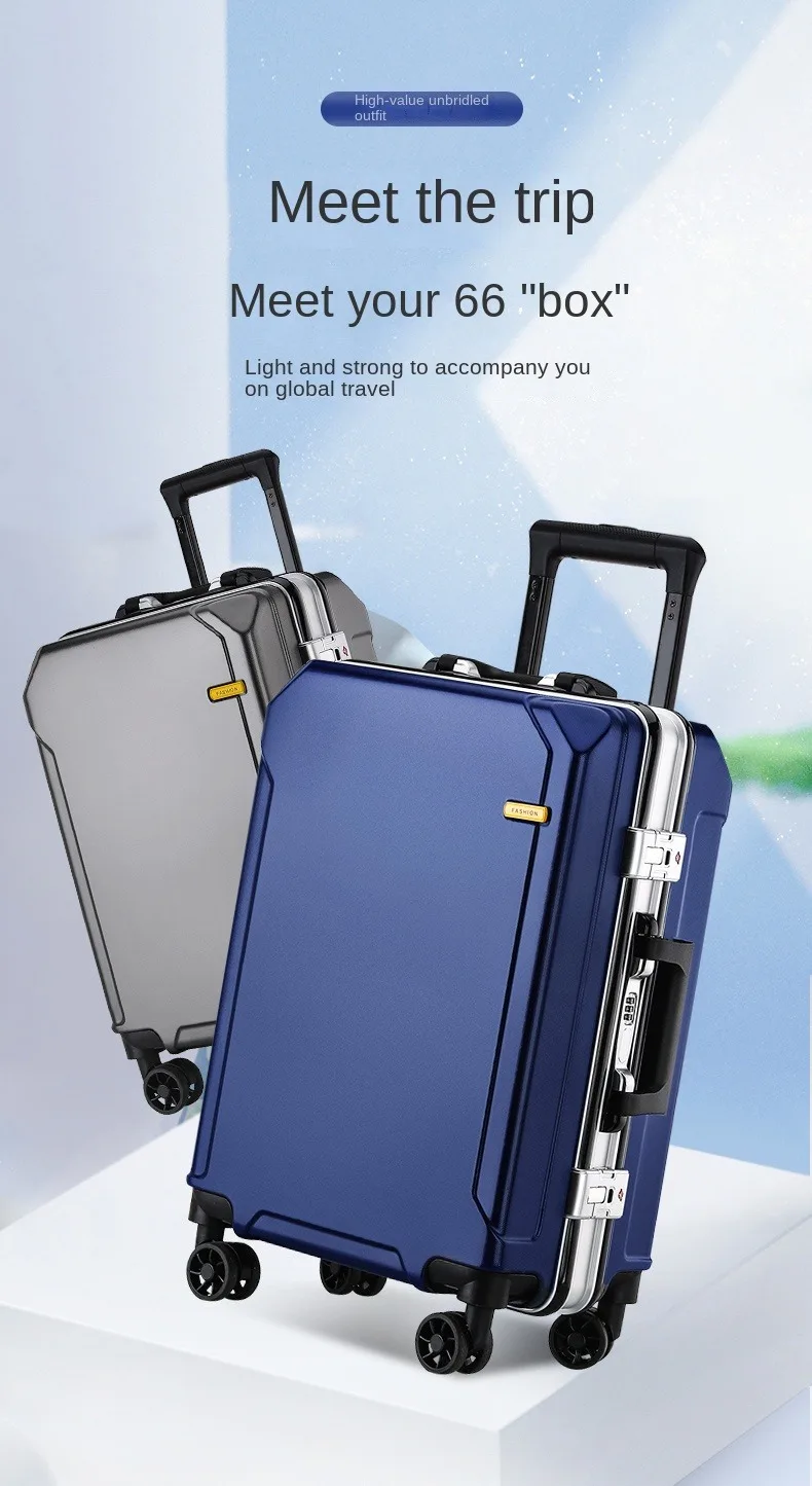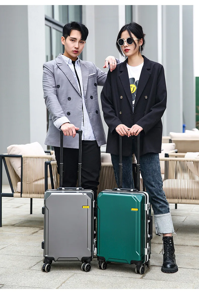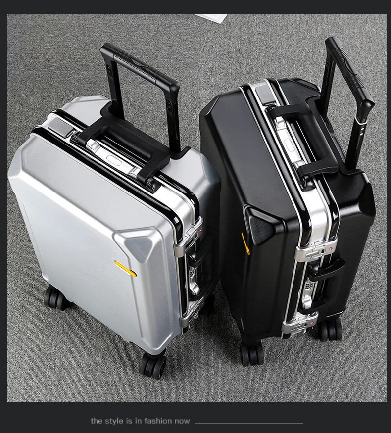 Introducing the Fashion Aluminum Frame Travel Suitcase, your perfect companion for both business trips and leisurely getaways. Designed for the discerning modern traveler, this rolling suitcase seamlessly blends sophisticated aesthetics with robust functionality. Whether you're navigating bustling airports or exploring new cities, its striking aluminum frame and premium construction ensure your belongings are protected in style. Available in a spectrum of chic colors including pink, yellow, dark blue, silver, black, dark grey, white, and dark green, and in versatile sizes (20-inch, 22-inch, 24-inch, and 26-inch), there’s a perfect match for every journey and every traveler.