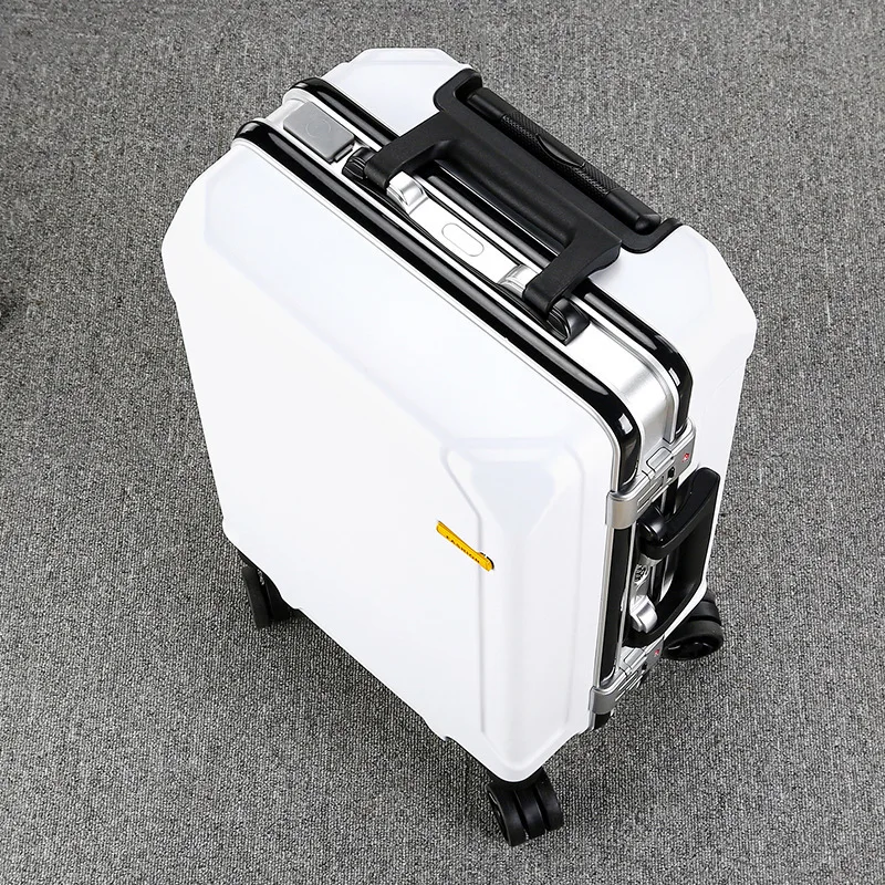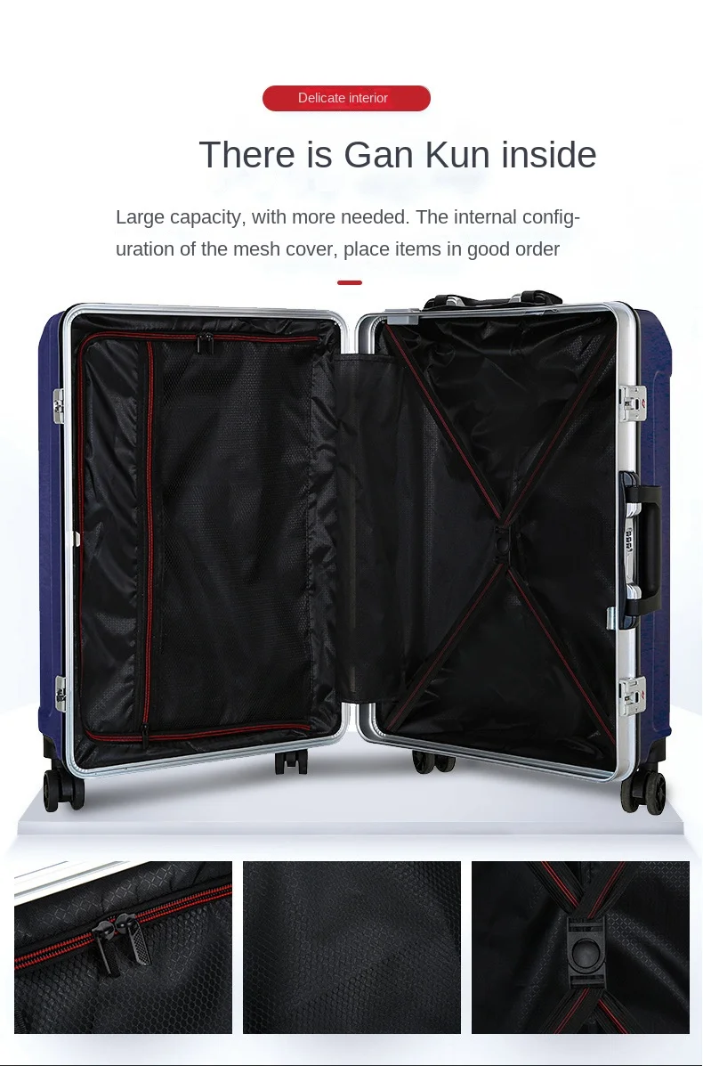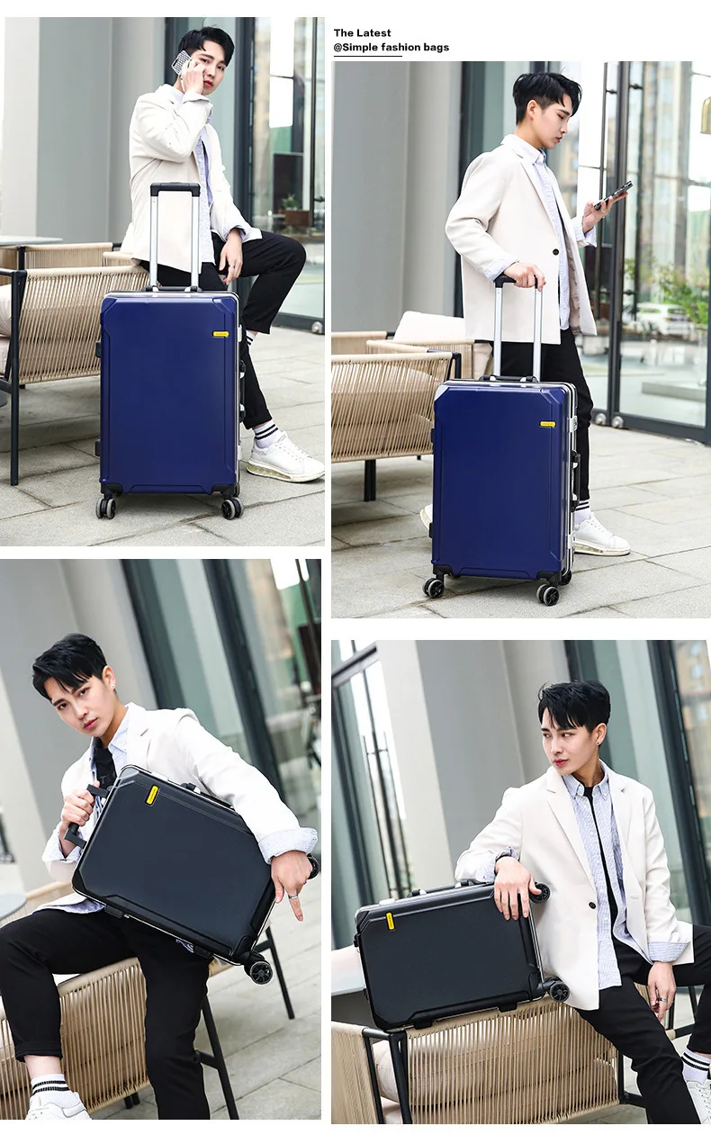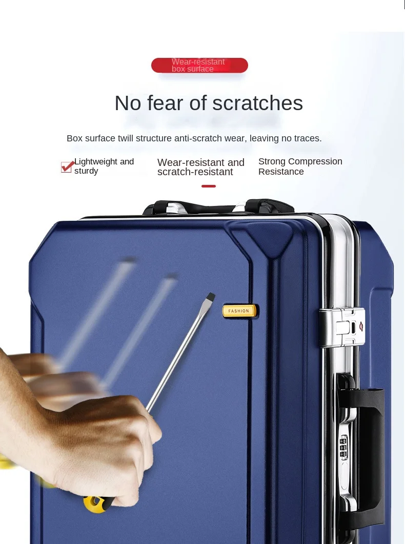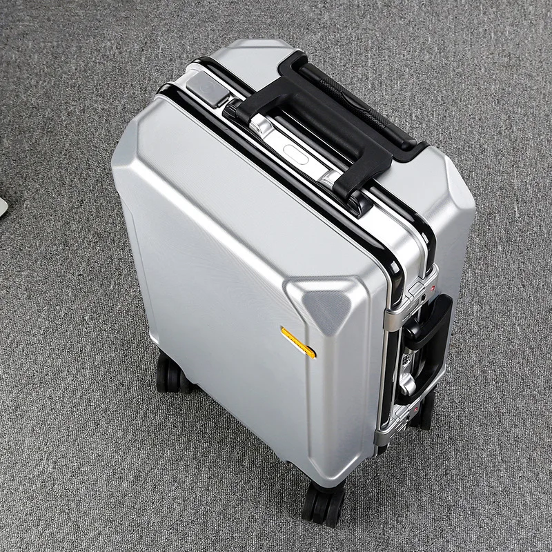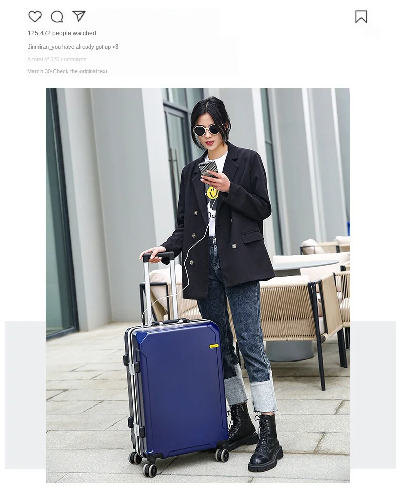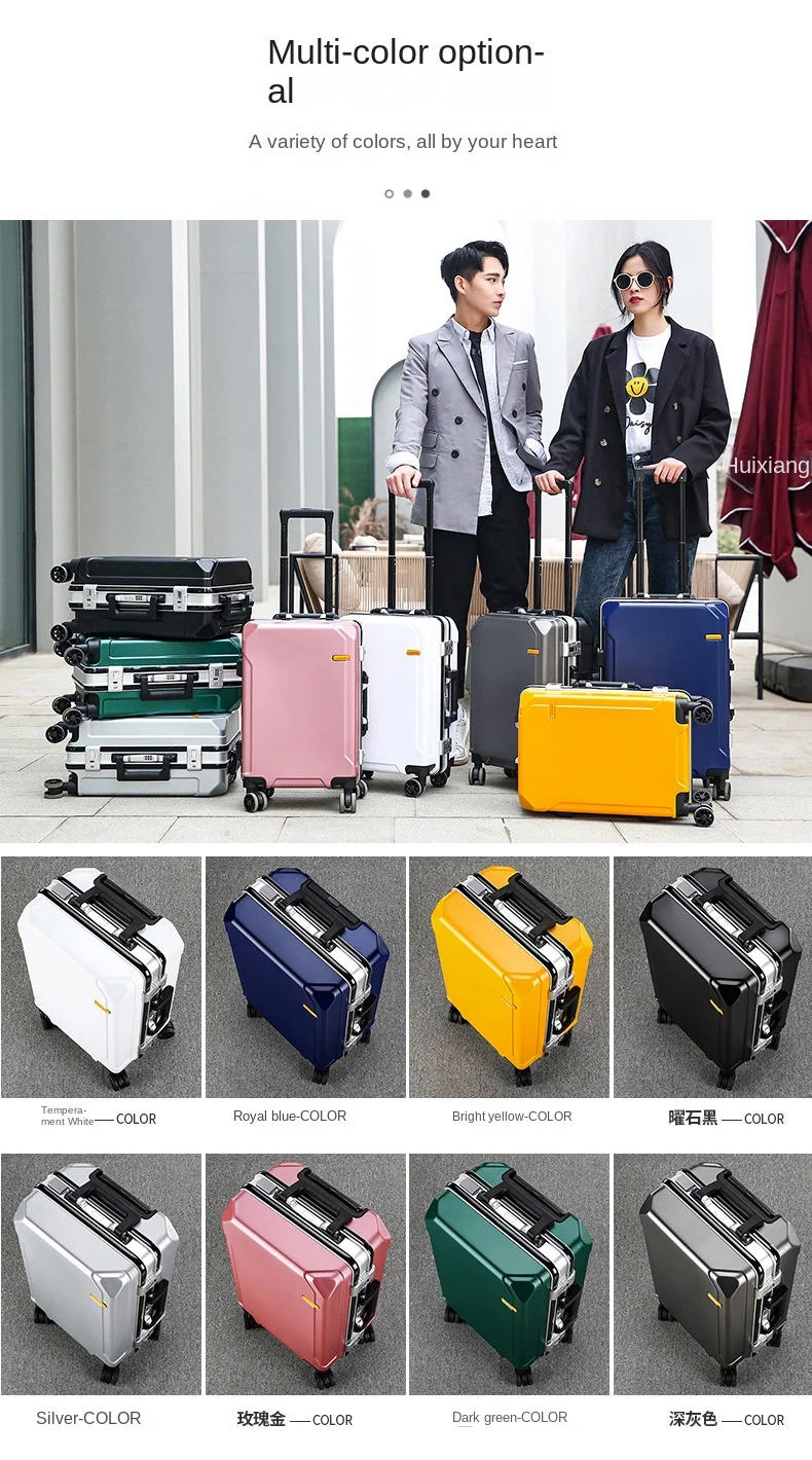 Introducing the Fashion Aluminum Frame Travel Suitcase, your perfect companion for both business trips and leisurely getaways. Designed for the discerning modern traveler, this rolling suitcase seamlessly blends sophisticated aesthetics with robust functionality. Whether you're navigating bustling airports or exploring new cities, its striking aluminum frame and premium construction ensure your belongings are protected in style. Available in a spectrum of chic colors including pink, yellow, dark blue, silver, black, dark grey, white, and dark green, and in versatile sizes (20-inch, 22-inch, 24-inch, and 26-inch), there’s a perfect match for every journey and every traveler.