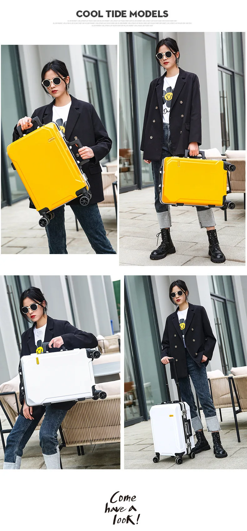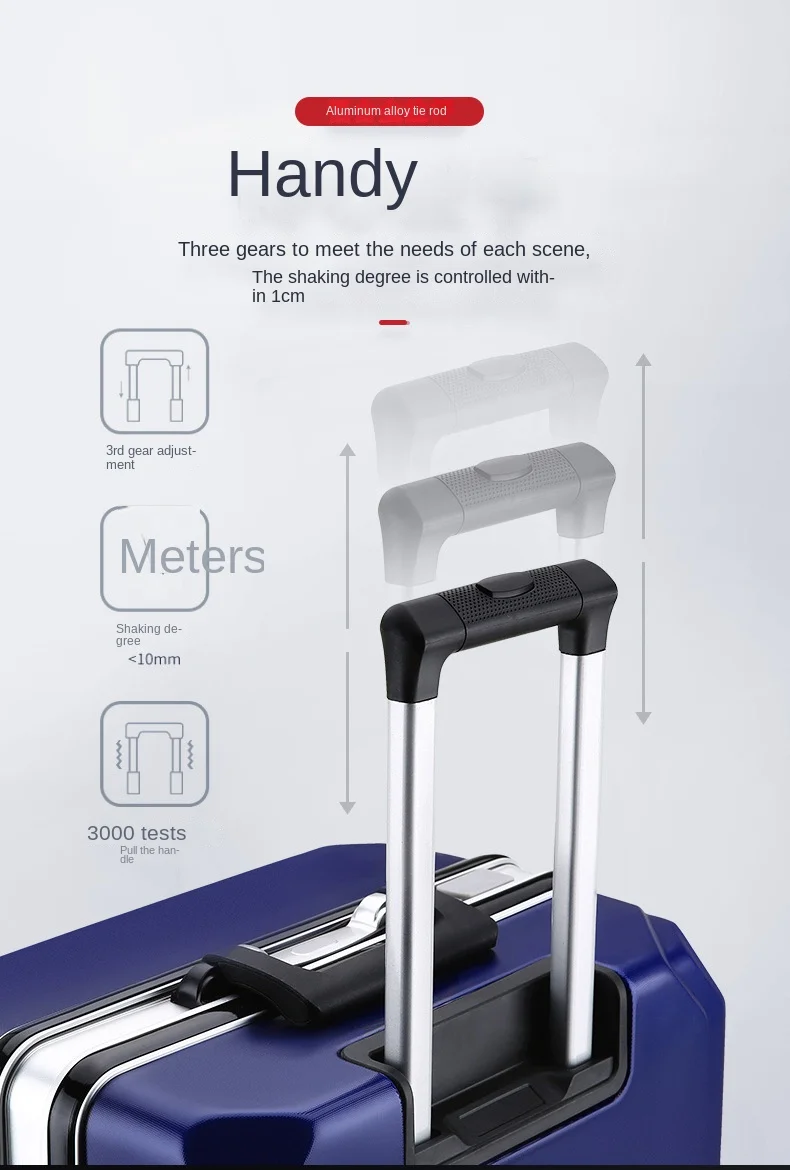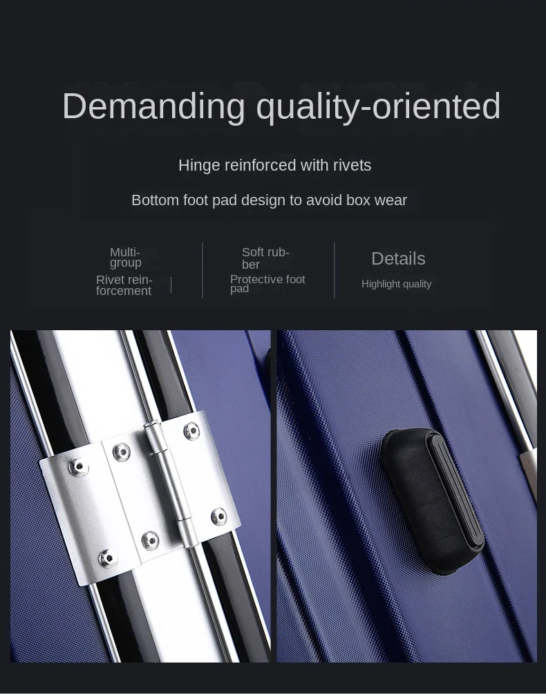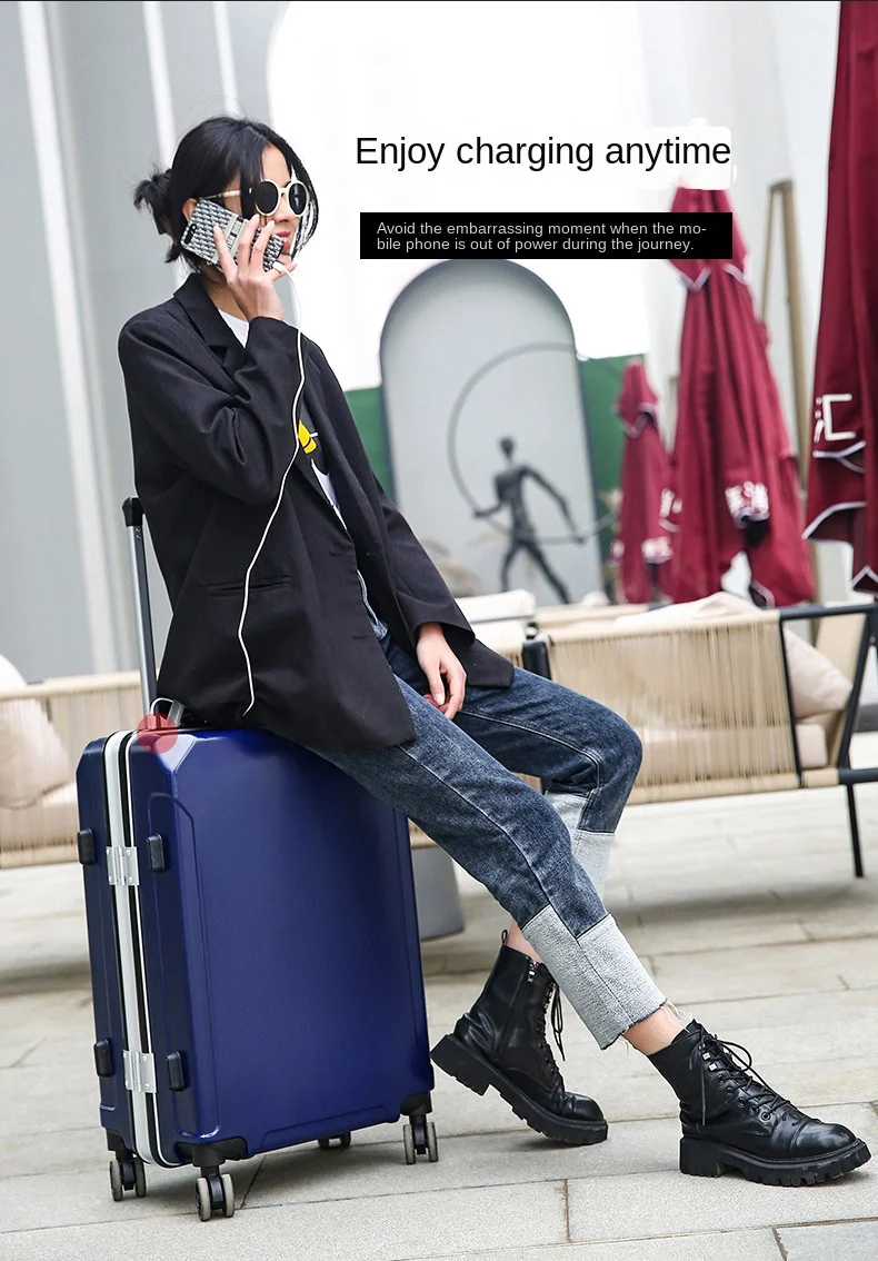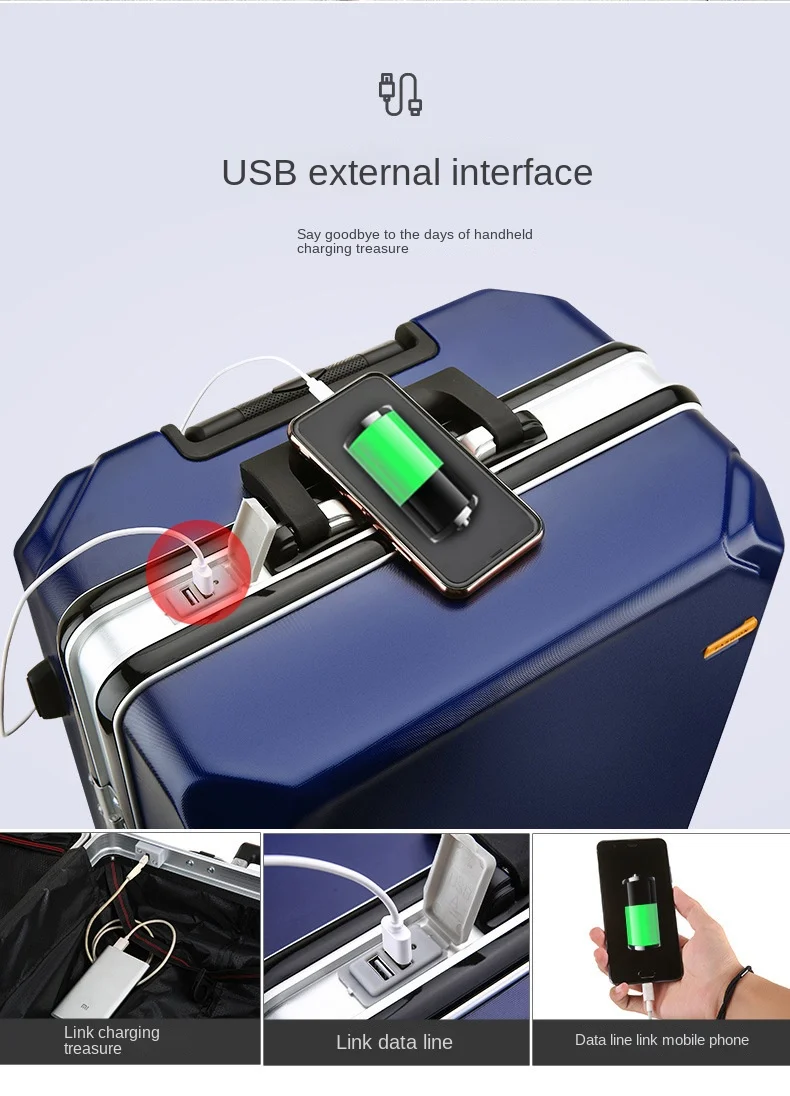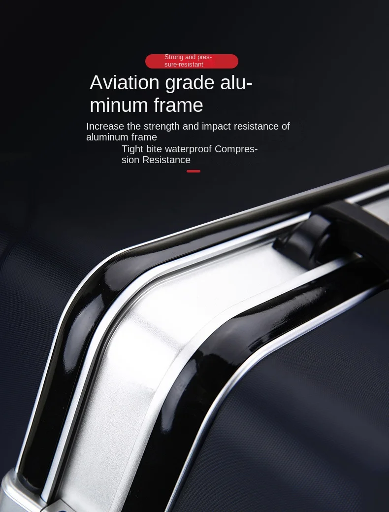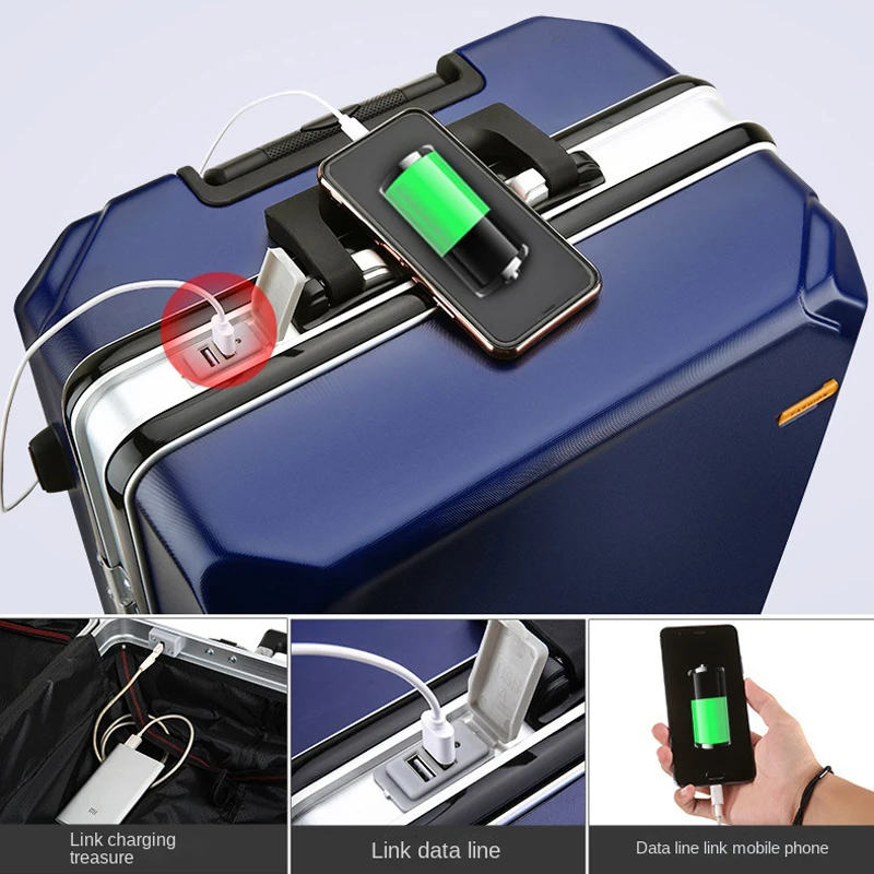 Introducing the Fashion Aluminum Frame Travel Suitcase, your perfect companion for both business trips and leisurely getaways. Designed for the discerning modern traveler, this rolling suitcase seamlessly blends sophisticated aesthetics with robust functionality. Whether you're navigating bustling airports or exploring new cities, its striking aluminum frame and premium construction ensure your belongings are protected in style. Available in a spectrum of chic colors including pink, yellow, dark blue, silver, black, dark grey, white, and dark green, and in versatile sizes (20-inch, 22-inch, 24-inch, and 26-inch), there’s a perfect match for every journey and every traveler.