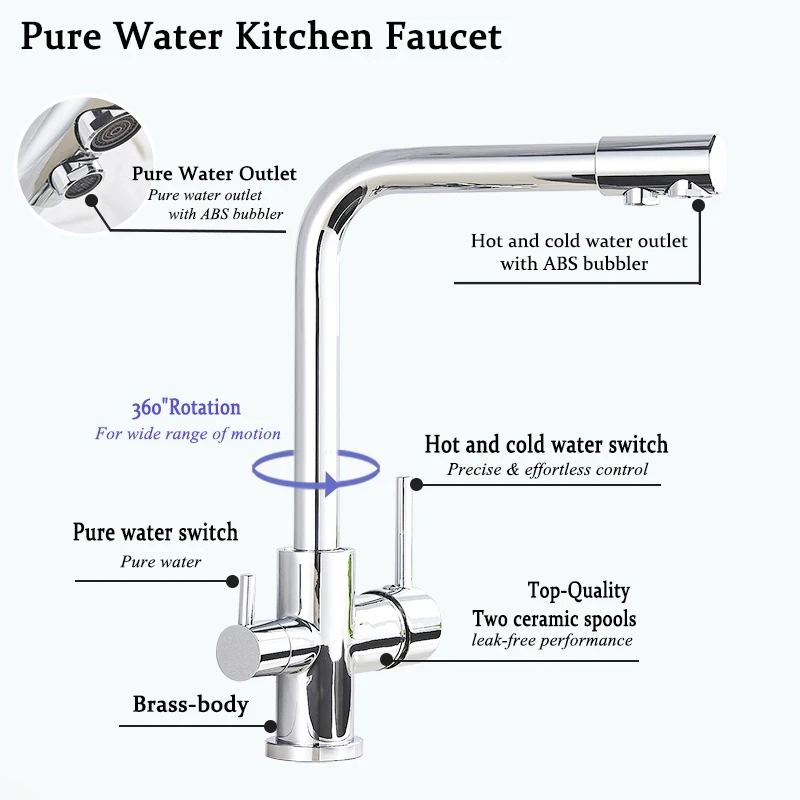 This faucet simplifies your daily kitchen routine by offering instant access to pure drinking water alongside regular hot and cold water, eliminating the need for separate filtration units or additional taps. Its dual-handle design provides intuitive control, making it easy to adjust water temperature and flow precisely as needed. Whether you’re cooking, cleaning, or preparing beverages, this faucet enhances efficiency and hygiene, promoting a healthier lifestyle with filtered water at your fingertips.