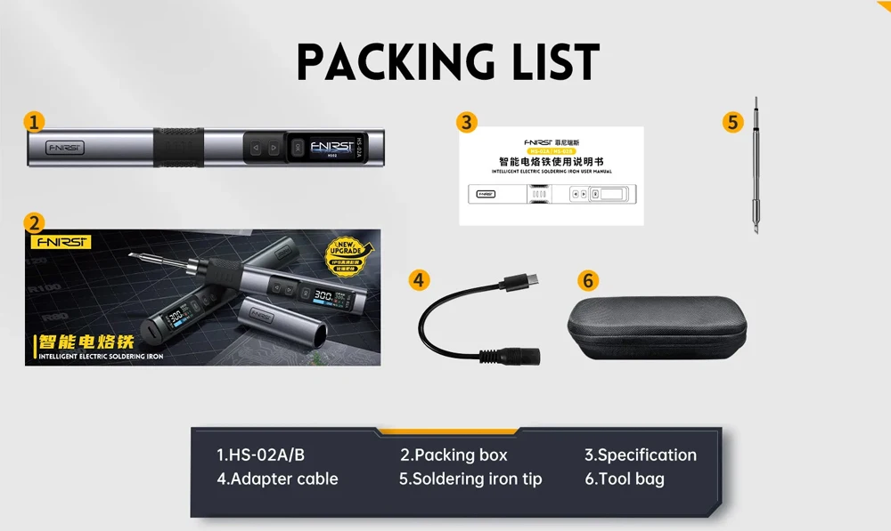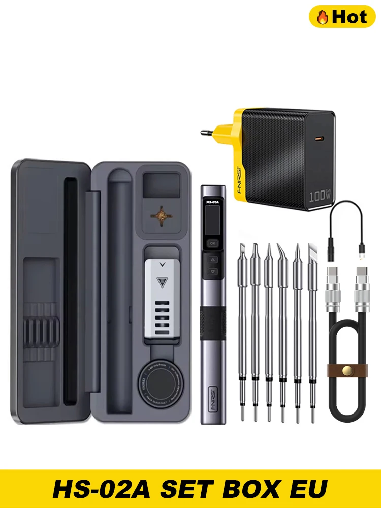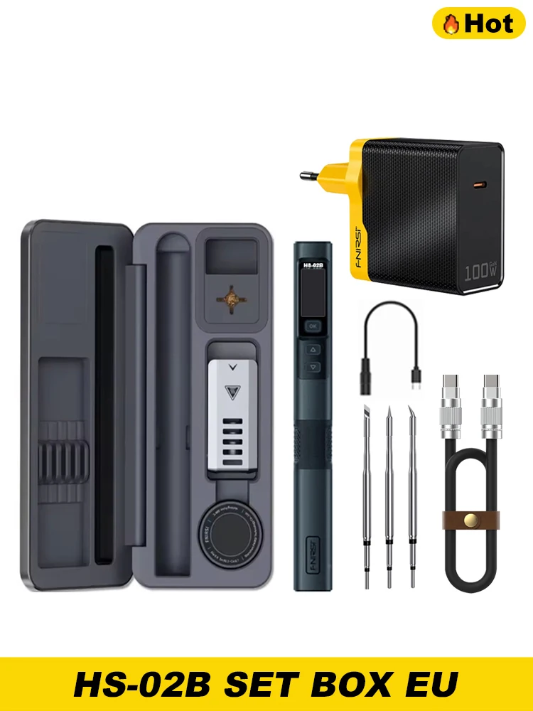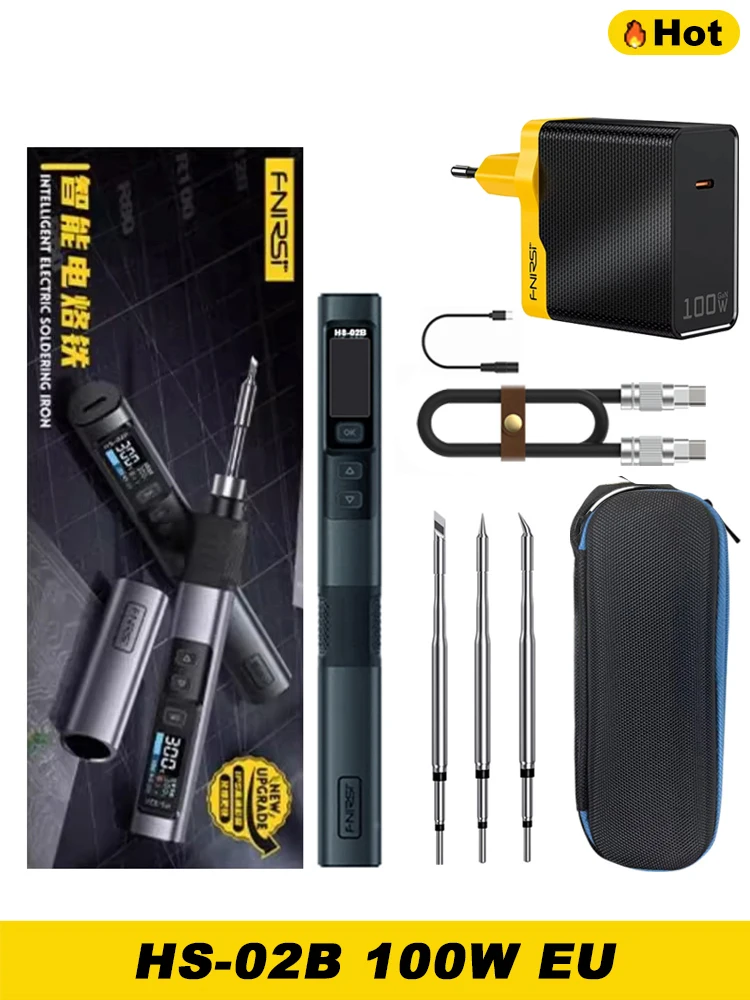 The FNIRSI HS-02 is engineered for durability and performance. Please refer to the specific attribute selected for the exact package contents. Ensure the power adapter used meets the PD100W input requirements for optimal performance. For best results and longevity, keep the soldering tip clean and tinned when not in use.