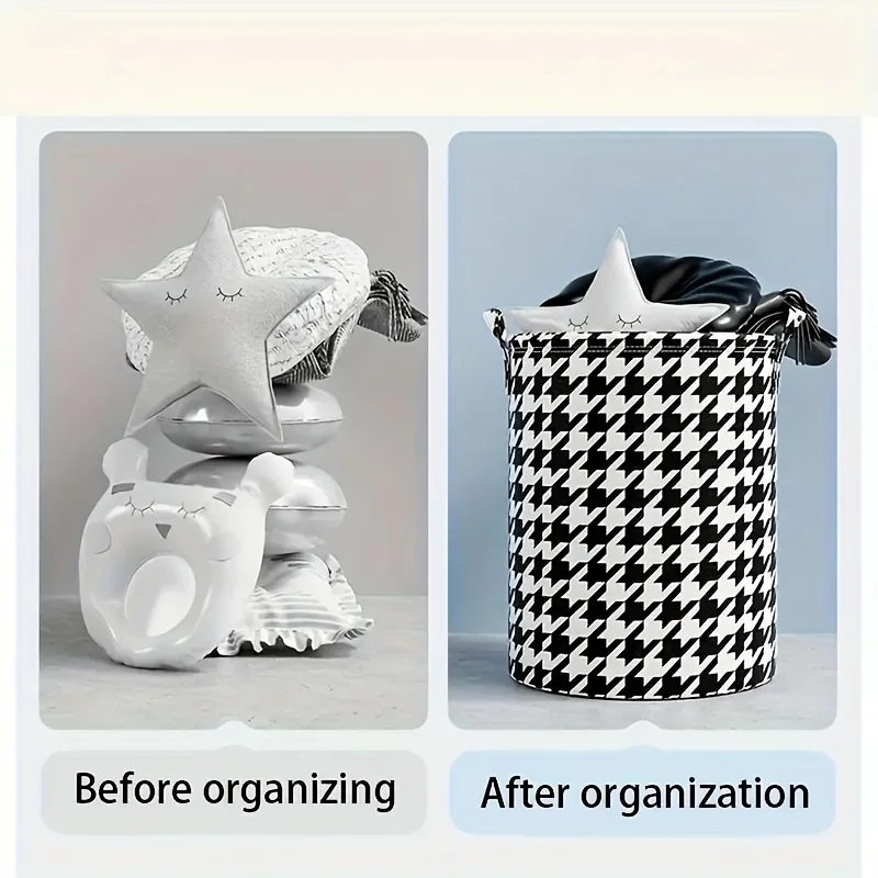This versatile hamper streamlines your household chores by providing a dedicated space for laundry or miscellaneous items. Its foldable nature allows you to optimize space, making it perfect for apartments or smaller living areas. The elegant houndstooth design elevates your room’s aesthetic while the handles enable effortless transport from room to laundry area. Whether used for dirty clothes, toys, or other household items, this storage basket adapts to your lifestyle with ease.
