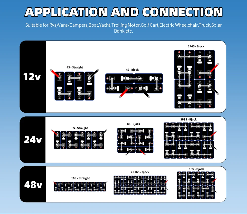 – Designed for easy integration into DIY 12 V and 24 V battery systems, ideal for solar energy setups, RV power banks, and portable camping power solutions.
