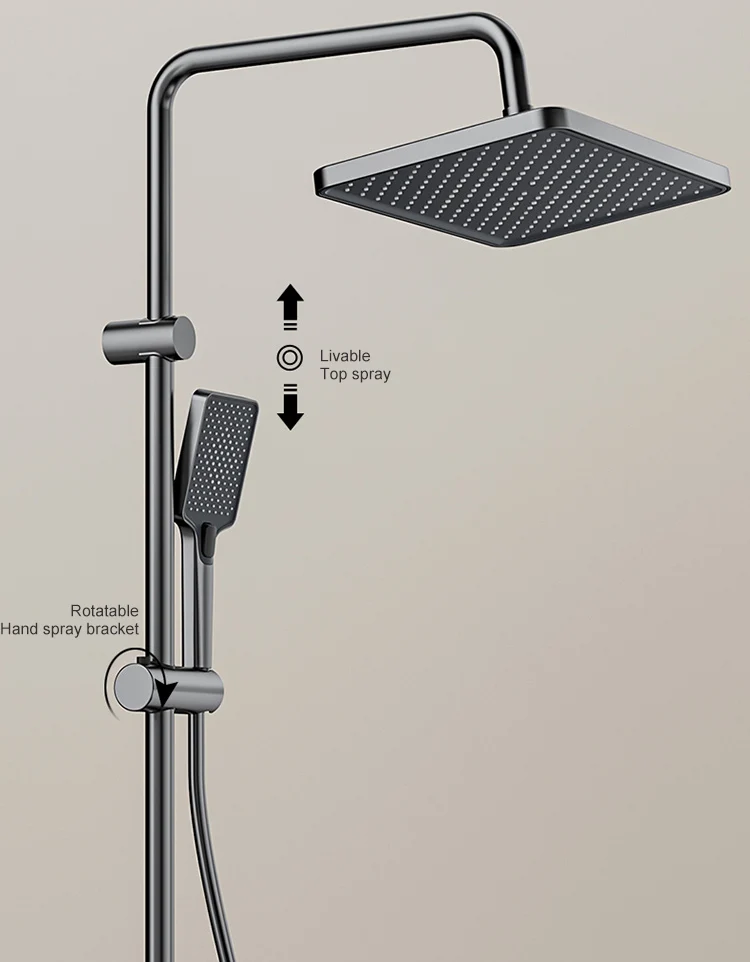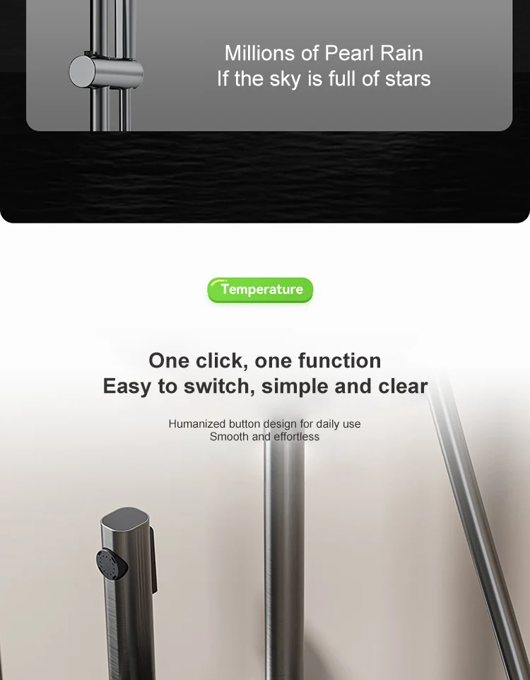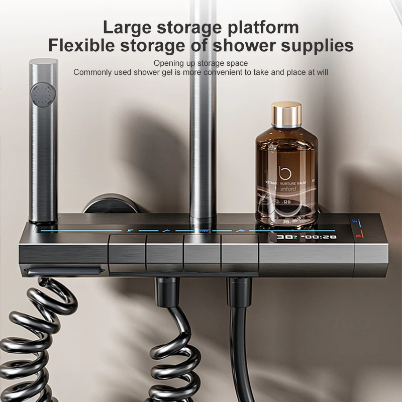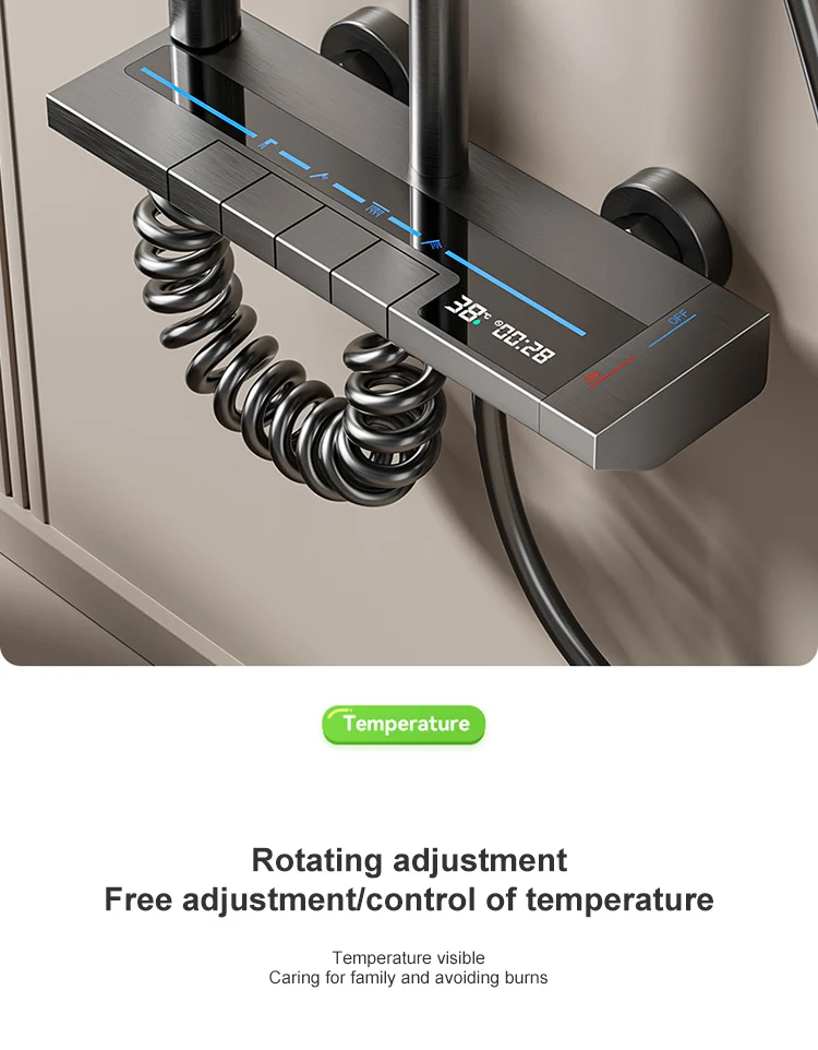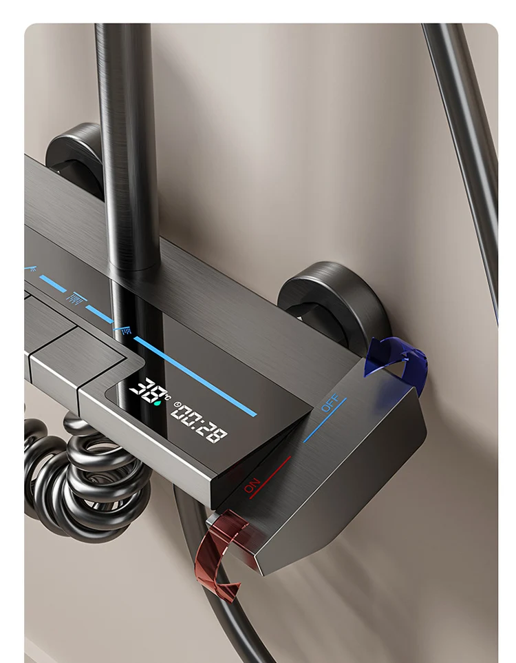 Transform your daily shower into a spa-like sanctuary with our Grey Piano Button Ambient Light Bathroom Shower Full Set. This meticulously designed digital display shower system offers a harmonious blend of sophisticated aesthetics and cutting-edge functionality, promising an unparalleled bathing experience. Crafted for the discerning individual who appreciates both form and function, this full set integrates seamlessly into any modern bathroom, providing a touch of elegance and advanced control over your water environment.