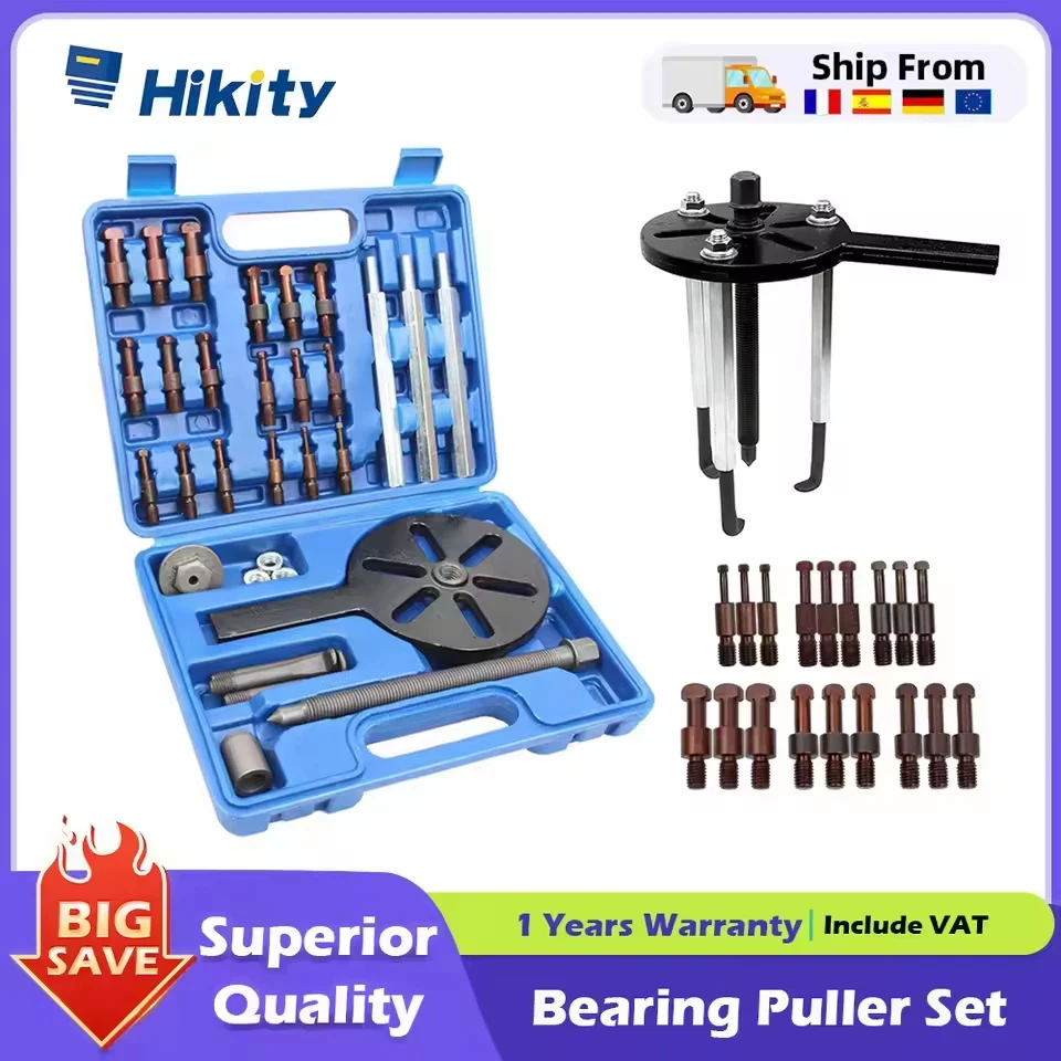 Hikity 21-in-1 Bearing Puller Set offers versatile extraction with three-jaw pullers for inside and outside bearings. Durable, easy-to-use tools come neatly organized in a compact box. Ideal for precise, efficient bearing removal. Ships from Germany and France for fast delivery.