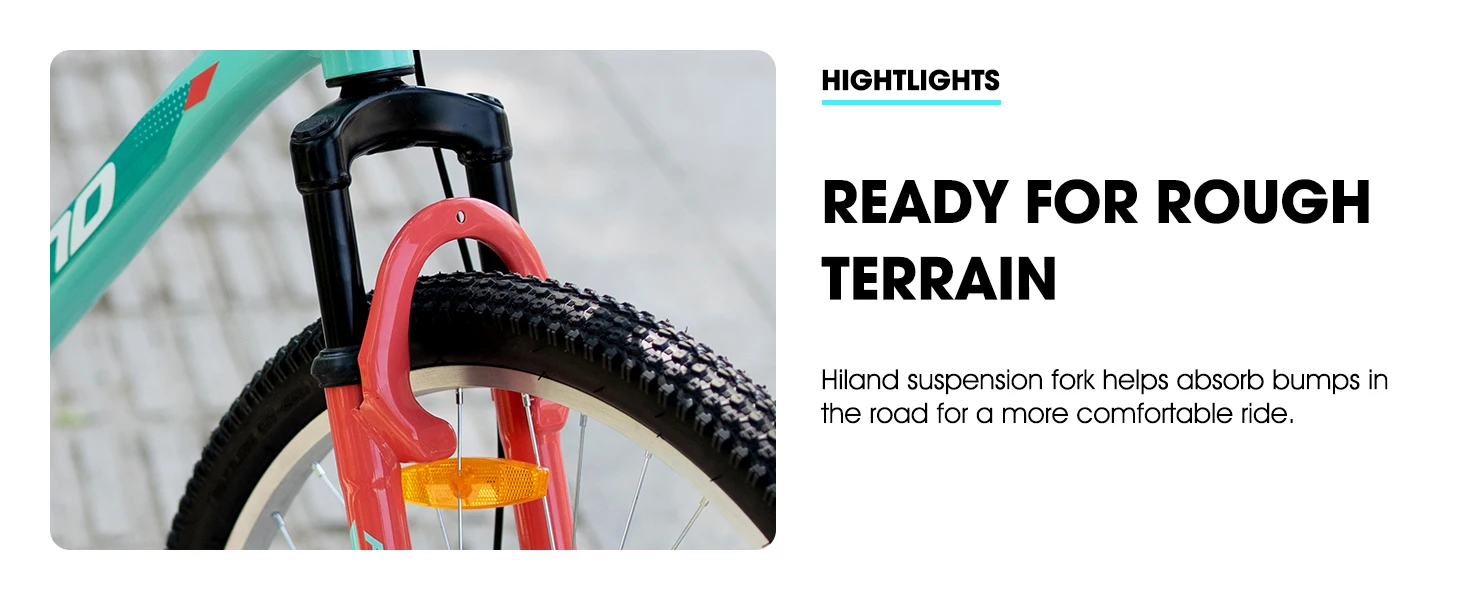 The HILAND mountain bike is designed to empower women and girls to explore the outdoors confidently. Its adjustable 21-speed transmission makes climbing hills and cruising downhill effortless, while the suspension fork significantly reduces fatigue by smoothing out rough paths. The ergonomic frame geometry promotes a comfortable riding posture, reducing strain during long rides. Perfect for sports enthusiasts, recreational cyclists, or anyone looking to embrace an active lifestyle, this MTB offers reliable performance for trail rides, commuting, or casual weekend excursions.