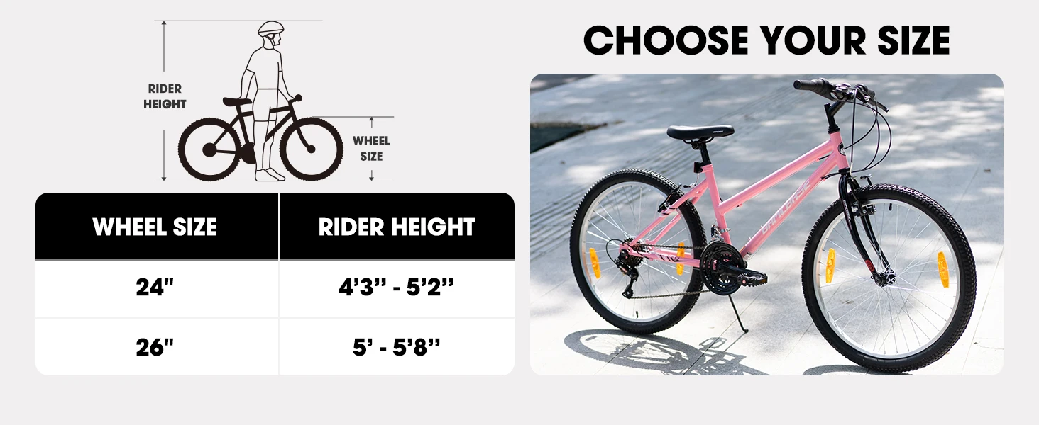 - Two frame sizes: 24 Inch and 26 Inch for comfortable and efficient riding fit