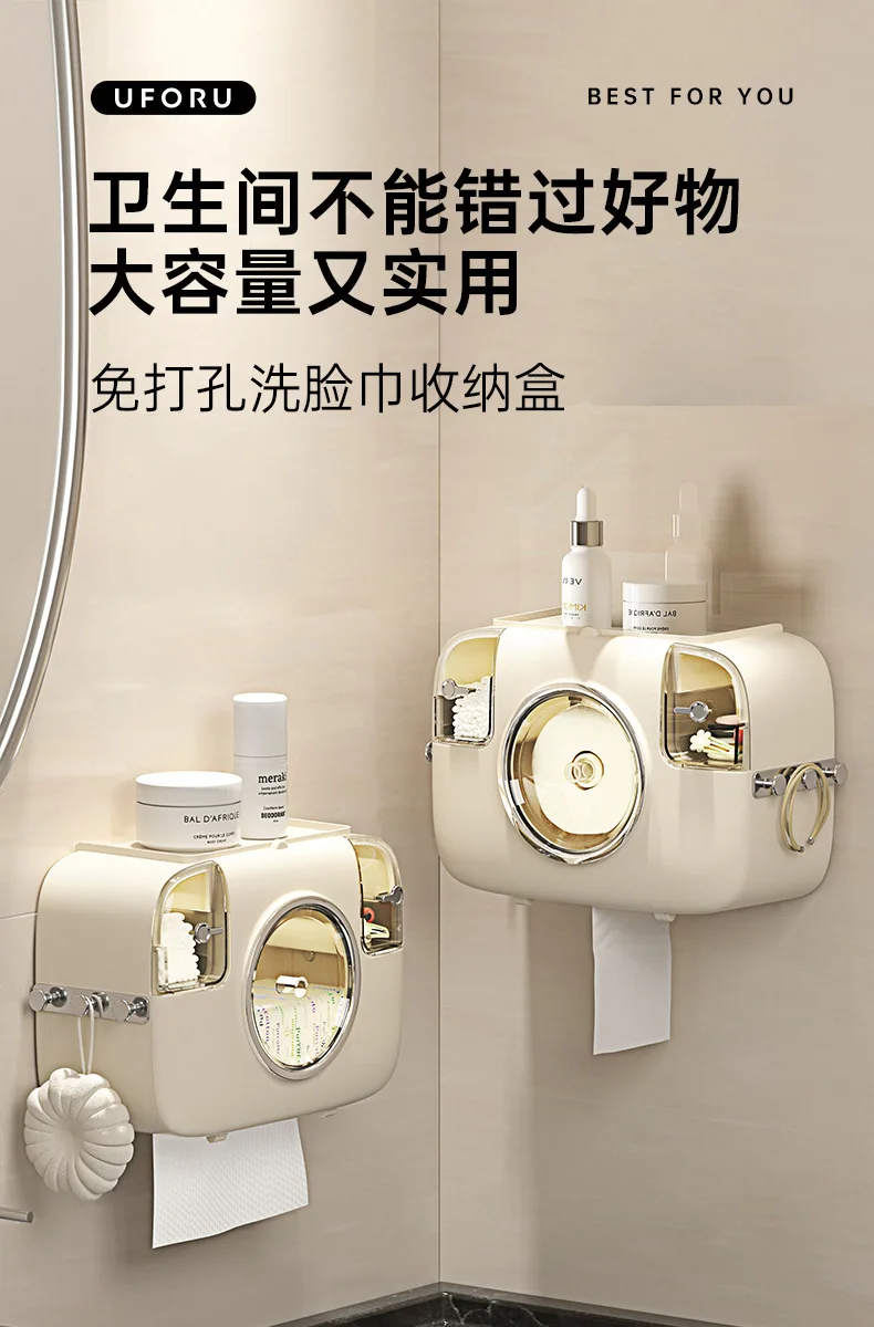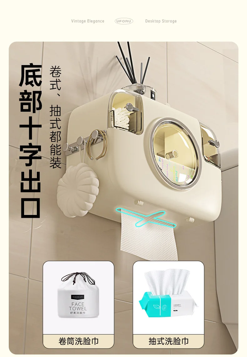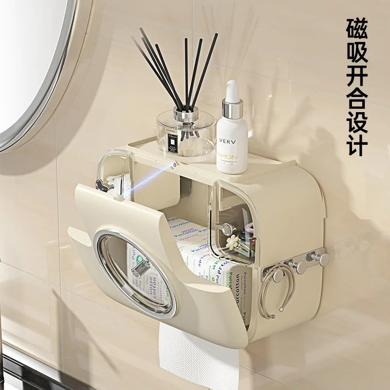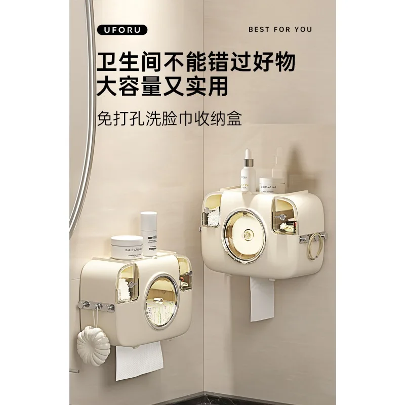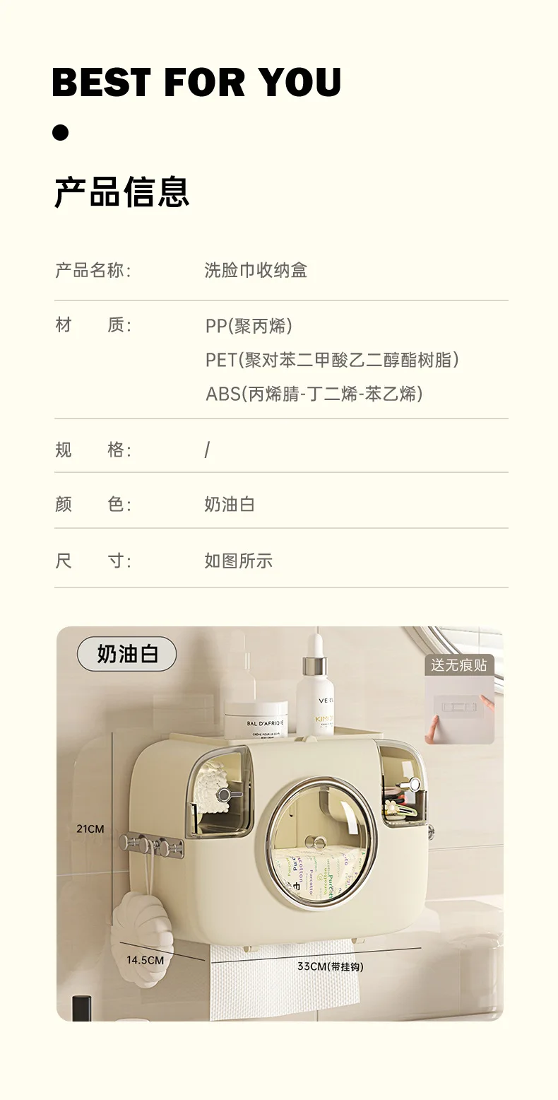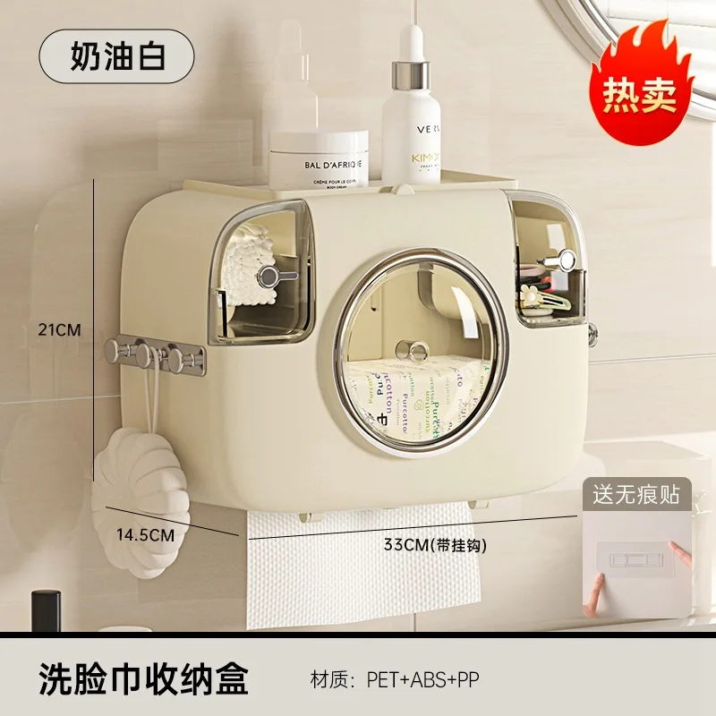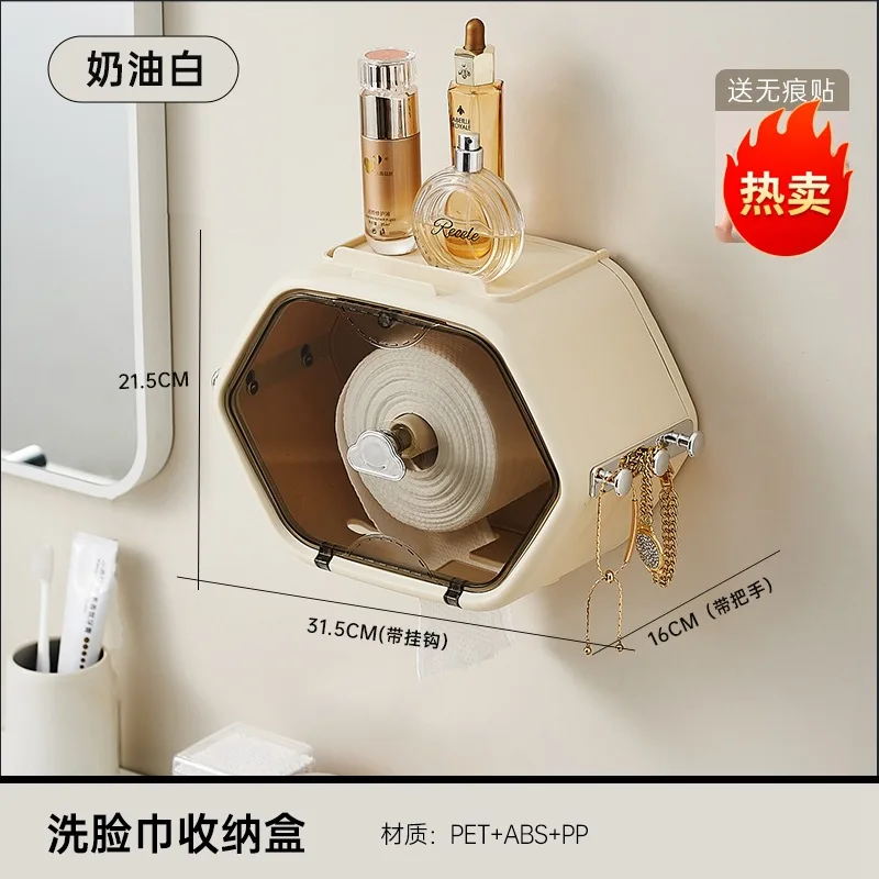 Household Face Towel Storage Box Bathroom Multi-Functional Paper Extraction Box Cream Wind Punch-Free Wall Hanging Waterproof