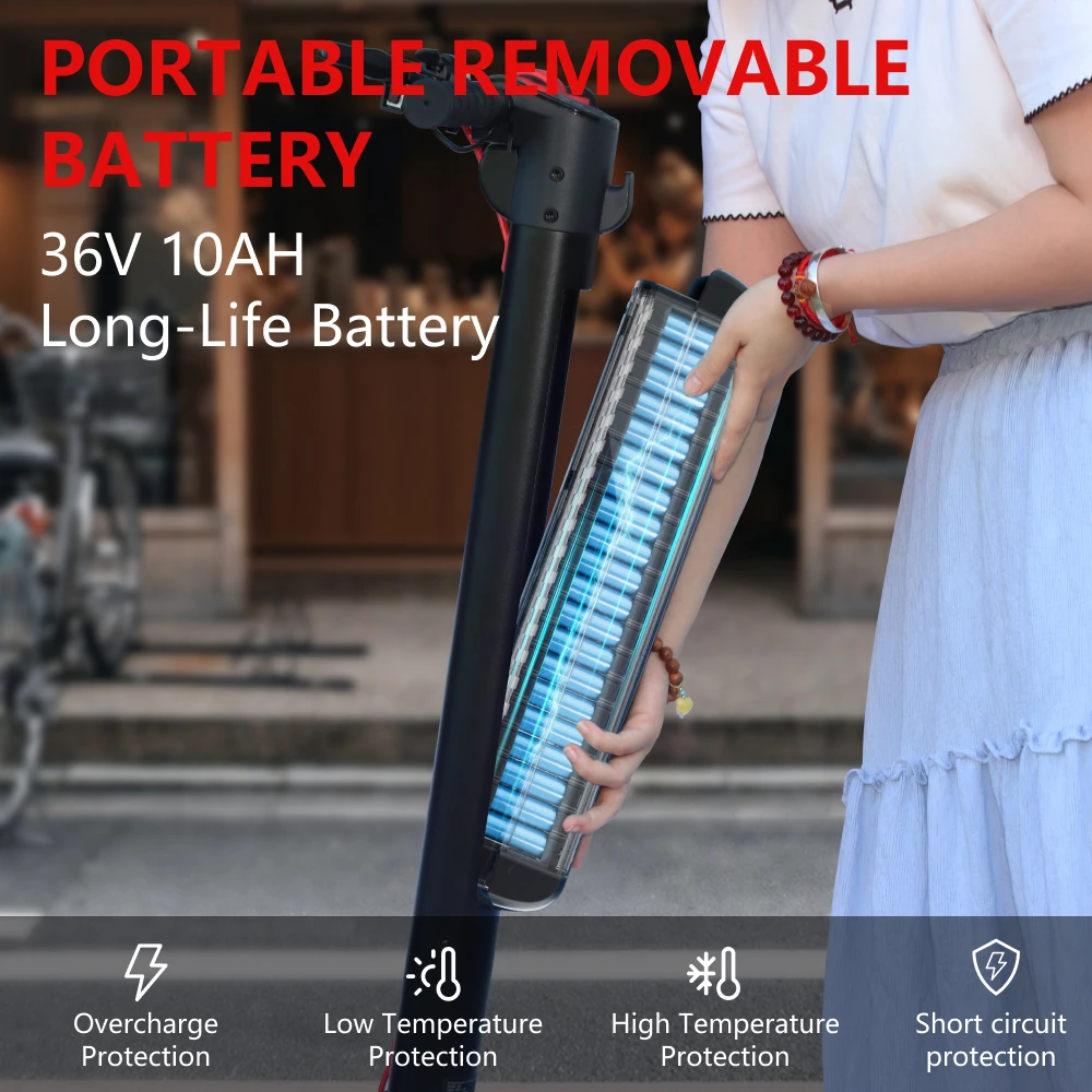 – 10 AH 36 V removable lithium-ion battery for extended range and easy charging.