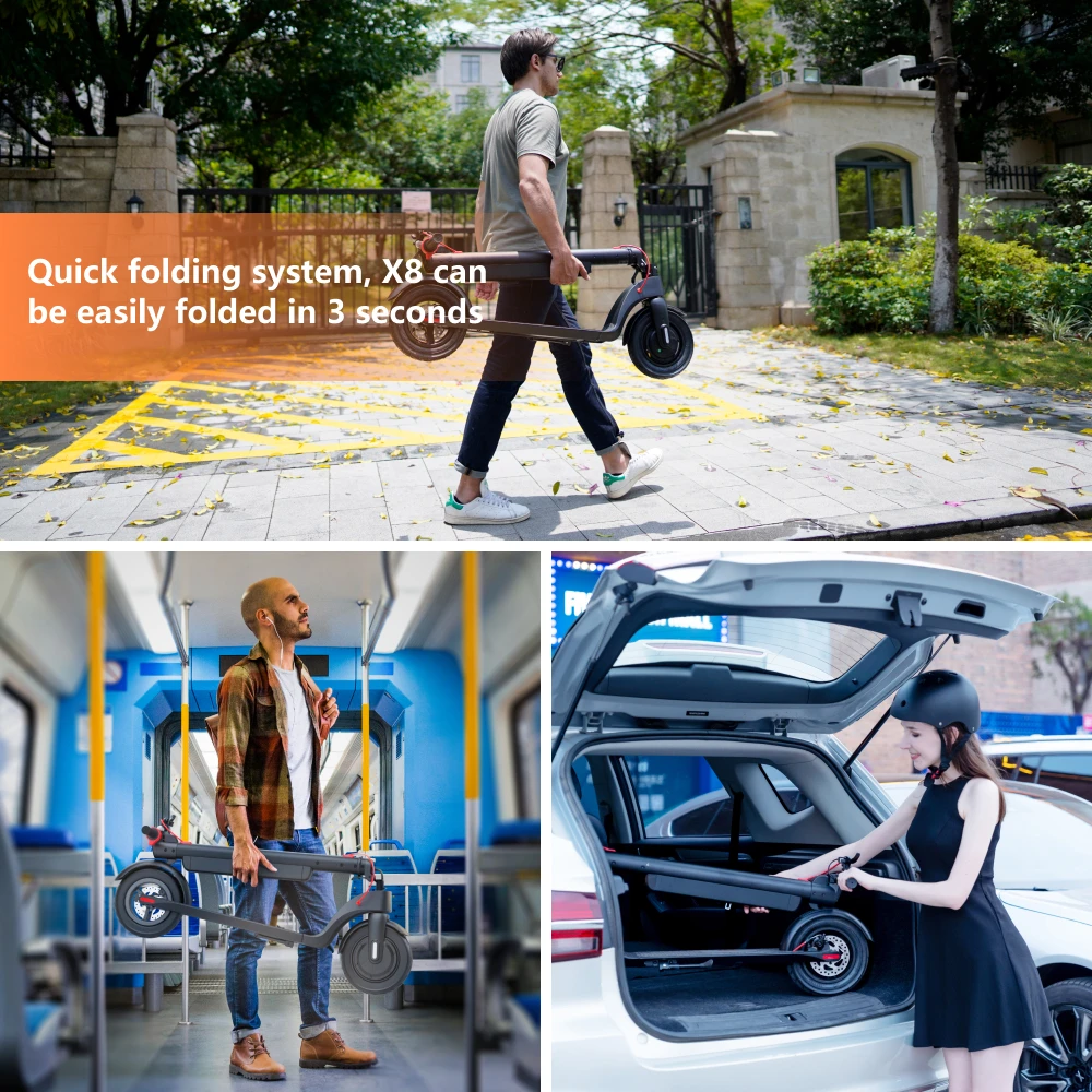 The HX X8 Electric Scooter is perfect for urban commuters seeking an efficient and eco-friendly transportation solution. Its foldable design allows you to carry it on public transport or store it conveniently at work or home. The removable battery ensures you can recharge effortlessly without needing to bring the entire scooter indoors. Whether you’re heading to the office, running errands, or exploring parks, this scooter’s powerful motor and durable wheels guarantee a smooth and enjoyable ride every time.